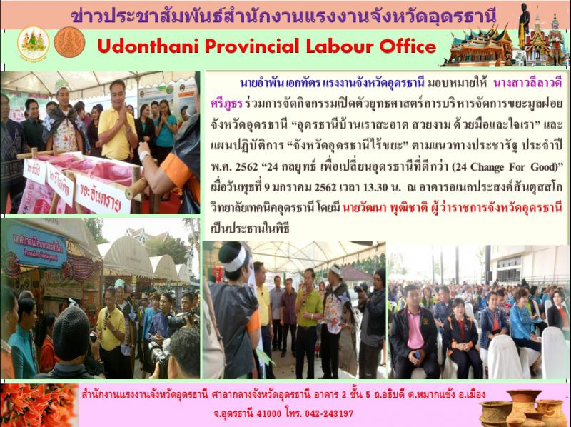 การจัดกิจกรรมเปิดตัวยุทธศาสตร์การบริหารจัดการขยะมูลฝอยจังหวัดอุดรธานี "อุดรธานีบ้านเราสะอาด สวยงาม ด้วยมือและใจเรา" และ แผนการปฏิบัติการ "จังหวัดอุดรธานีไต้ขยะ" ตามแนวทางประชารัฐ ประจำปี พ.ศ.2562 "24 กลยุทธ์ เพื่อเปลี่ยนอุดรที่ดีกว่า (24 Change For Good)"