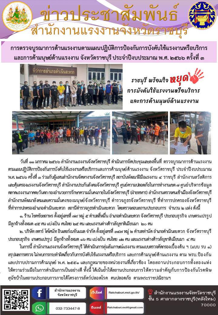 สรจ.ราชบุรี การตรวจบูรณาการด้านแรงงานตามแผนปฏิบัติการป้องกันการบังคับใช้แรงงานหรือบริการ และการค้ามนุษย์ด้านแรงงาน จังหวัดราชบุรี ประจำปีงบประมาณ พ.ศ. ๒๕๖๖ ครั้งที่ ๓