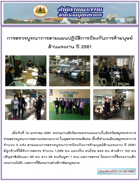 การตรวจบูรณาการตามแผนปฏิบัติการป้องกันการค้ามนุษย์ด้านแรงงาน ปี 2561 จังหวัดสมุทรปราการ