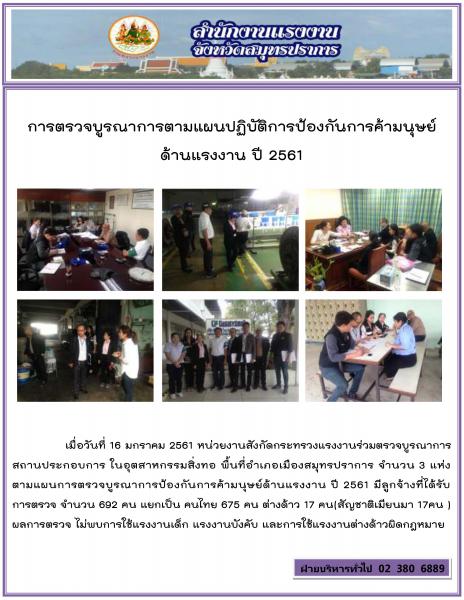 การตรวจบูรณาการตามแผนปฏิบัติการป้องกันการค้ามนุษย์ ด้านแรงงาน ปี 2561 จังหวัดสมุทรปราการ