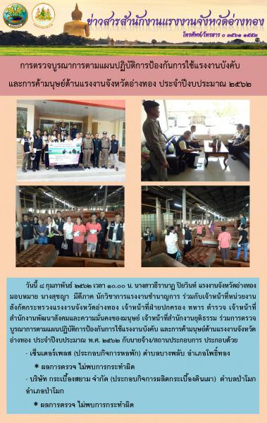 การตรวจบูรณาการตามแผนปฏิบัติการป้องกันการใช้แรงงานบังคับ และการค้ามนุษย์ด้านแรงงานจังหวัดอ่างทอง ประจำปีงบประมาณ 2562