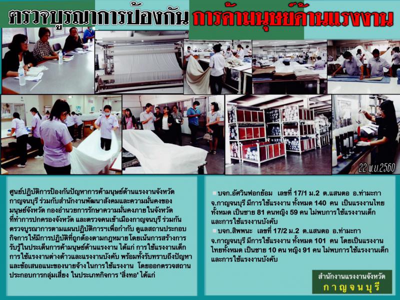 ‘กาญจนบุรี’ ผนึกกำลัง ตรวจบูรณาการ กลุ่มเสี่ยงประเภทกิการ ‘สิ่งทอ’ศูนย์ปฏิบัติการป้องกันปัญหาการค้ามนุษย์ด้านแรงงานจังหวัดกาญจนบุรี ร่วมกับสำนักงานพัฒนาสังคมและความมั่นคงของมนุษย์จังหวัด กองอำนวยการรักษาความมั่นคงภายในจังหวัด ที่ทำการปกครองจังหวัด และตรวจคนเข้าเมืองกาญจนบุรี ร่วมกันตรวจบูรณาการตามแผนปฏิบัติการฯเพื่อกำกับ ดูแลสถานประกอบกิจการให้มีการปฏิบัติที่ถูกต้องตามกฎหมายโดยเน้นการสร้างการรับรู้ในประเด็นการค้ามนุษย์ด้านแรงงาน ได้แก่ การใช้แรงงานเด็ก การใช้แรงงานต่างด้าวและแรงงานบังคับ พร้อมทั้งรับทราบถึงปัญหาและข้อเสนอแนะของนายจ้างในการใช้แรงงาน โดยออกตรวจสถานประกอบการกลุ่มเสี่ยง ในประเภทกิจการ ‘สิ่งทอ’ ได้แก่