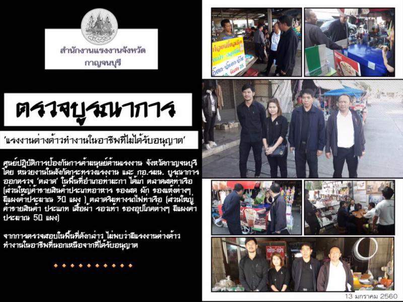 การตรวจบูรณาการแรงงานต่างด้าวทำงานในอาชีพที่ไม่ได้รับอนุญาต หน่วยงานในสังกัดกระทรวงแรงงานและ กอ.รมน. บูรณาการออกตรวจตลาด ในอำเภอท่ามะกาประมาณ 80 แผง จากการตรวจดังกล่าวไม่พบแรงงานต่างด้าวทำงานในอาชีพที่นอกเหนือจากที่ไดรับอนุญาต