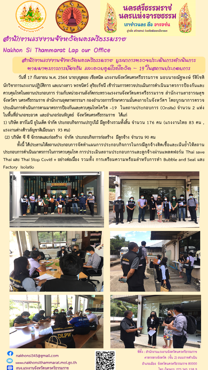 โดยได้ประสานให้สถานประกอบการจัดทำแผนการประกอบกิจการในกรณีลูกจ้างติดเชื้อและเน้นย้ำให้สถานประกอบการดำเนินมาตรการในการควบคุมโรคการประเมินสถานประกอบการและลูกจ้างผ่านแพลตฟอร์ม Thai save Thai และ Thai Stop Covid + อย่างต่อเนื่อง รวมทั้ง การเตรียมความพร้อมสำหรับการทำ Bubble and Seal และ Factory Isolatio