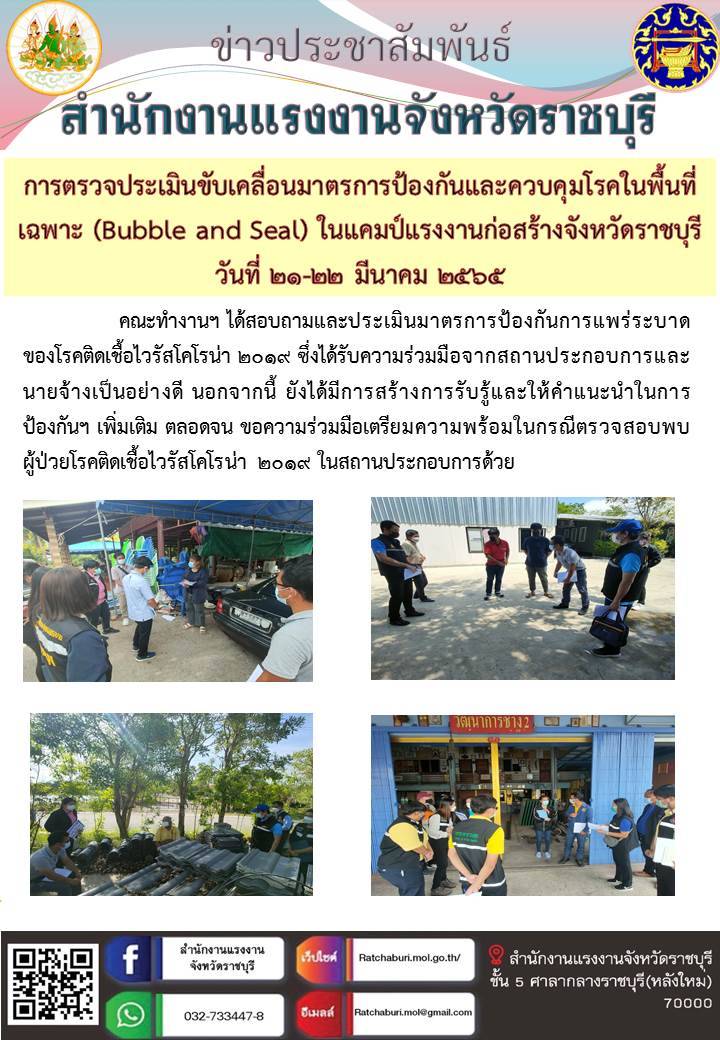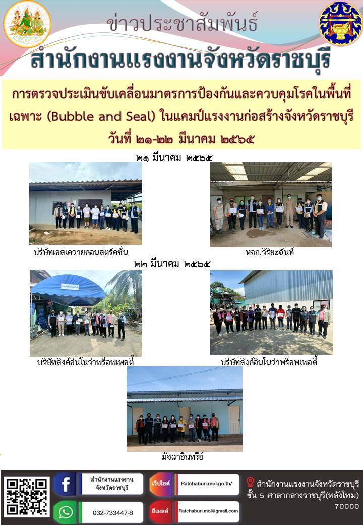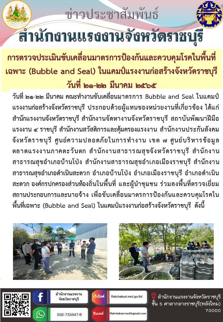 วันที่ ๒๑-๒๒ มีนาคม ๒๕๖๕ คณะทำงานขับเคลื่อนมาตรการ Bubble and Seal ในแคมป์แรงงานก่อสร้างจังหวัดราชบุรี ประกอบด้วยผู้แทนของหน่วยงานที่เกี่ยวข้อง ได้แก่ สำนักงานแรงงานจังหวัดราชบุรี สำนักงานจัดหางานจังหวัดราชบุรี สถาบันพัฒนาฝีมือแรงงาน ๔ ราชบุรี สำนักงานสวัสดิการและคุ้มครองแรงงาน สำนักงานประกันสังคมจังหวัดราชบุรี ศูนย์ความปลอดภัยในการทำงาน เขต ๗ ศูนย์บริหารข้อมูลตลาดแรงงานภาคตะวันตก สำนักงานสาธารณสุขจังหวัดราชบุรี สำนักงานสาธารณสุขอำเภอบ้านโป่ง สำนักงานสาธารณสุขอำเภอเมืองราชบุรี สำนักงานสาธารณสุขอำเภอดำเนินสะดวก อำเภอบ้านโป่ง อำเภอเมืองราชบุรี อำเภอดำเนินสะดวก องค์กรปกครองส่วนท้องถิ่นในพื้นที่ และผู้นำชุมชน ร่วมลงพื้นที่ตรวจเยี่ยมสถานประกอบการและนายจ้าง เพื่อขับเคลื่อนมาตรการป้องกันและควบคุมโรคในพื้นที่เฉพาะ (Bubble and Seal) ในแคมป์แรงงานก่อสร้างจังหวัดราชบุรี ดังนี้
