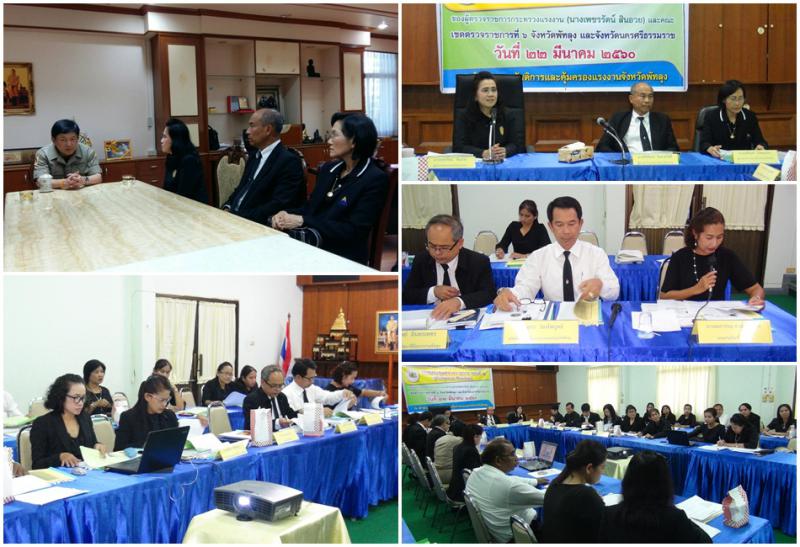 เมื่อวันที่ 22 มีนาคม 2560 นางเพชรรัตน์ สินอวย ผู้ตรวจราชการกระทรวงแรงงาน พร้อมด้วย นายศักดิ์สกล จินดาสวัสดิ์ ผู้ตรวจราชการกรม กรมการจัดหางาน นางรุ่งนิรันดร์ อังคเมธากร ผู้ตรวจราชการกรม สำนักงานประกันสังคม และคณะ เดินทางมาตรวจราชการเพื่อติดตามผลการปฏิบัติงานของหน่วยงานสังกัดกระทรวงแรงงาน ตามแผนการตรวจราชการของผู้ตรวจราชการกระทรวงแรงงาน ประจำปีงบประมาณ พ.ศ. ๒๕๖๐ รอบที่ 2 เขตการตรวจราชการที่ 6 จังหวัดพัทลุงและจังหวัดนครศรีธรรมราช โดยในวันดังกล่าวผู้ตรวจกระทรวงแรงงานและคณะ ได้เข้าเยี่ยมคารวะและปรึกษาหารือข้อราชการกับผู้ว่าราชการจังหวัดพัทลุง ต่อจากนั้นได้ประชุมหัวหน้าส่วนราชการสังกัดกระทรวงแรงงานจังหวัดนครศรีธรรมราช และจังหวัดพัทลุง เพื่อตรวจติดตามผลการปฏิบัติงาน และรับฟังข้อเสนอแนะภารกิจงานด้านแรงงานในพื้นที่ของแกนนำอาสาสมัครแรงงานระดับตำบล/อำเภอ จังหวัดพัทลุง ณ ห้องประชุมสำนักงานสวัสดิการและคุ้มครองแรงงานจังหวัดพัทลุง ชั้น 2