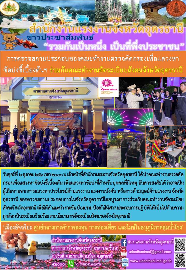 สรจ.อุดรธานี ตรวจสถานประกอบการของคณะทำงานตรวจคัดกรองเพื่อแสวงหาข้อบ่งชี้เบื้องต้นฯ ร่วมกับคณะทำงานจัดระเบียบสังคมจังหวัดอุดรธานี