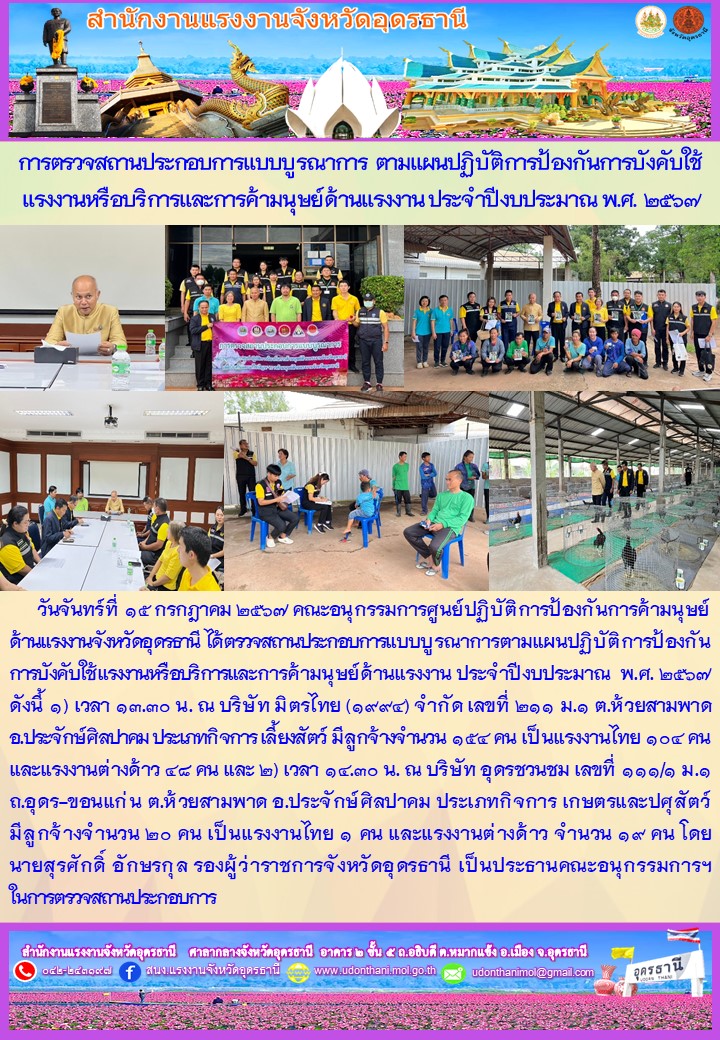 สรจ.อุดรธานี การตรวจสถานประกอบการแบบบูรณาการ ตามแผนปฏิบัติการป้องกันการบังคับใช้แรงงานหรือบริการและการค้ามนุษย์ด้านแรงงาน ประจำปีงบประมาณ พ.ศ. 2567
