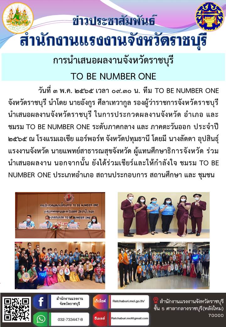 วันที่ 3 พ.ค. 2565 เวลา 09.30 น. ทีม TO BE NUMBER ONE จังหวัดราชบุรี นำโดย นายอังกูร ศีลาเทวากูล รองผู้ว่าราชการจังหวัดราชบุรี นำเสนอผลงานจังหวัดราชบุรี ในการประกวดผลงานจังหวัด อำเภอ และ ชมรม TO BE NUMBER ONE ระดับภาคกลาง และ ภาคตะวันออก ประจำปี 2565 ณ โรงแรมเอเชีย แอร์พอร์ท จังหวัดปทุมธานี โดยมี นางลัดดา อุปสินธุ์ แรงงานจังหวัด นายแพทย์สาธารณสุขจังหวัด ผู้แทนศึกษาธิการจังหวัด ร่วมนำเสนอผลงาน นอกจากนั้น ยังได้ร่วมเชียร์และ ให้กำลังใจ ชมรม TO BE NUMBER ONE ประเภทอำเภอ สถานประกอบการ สถานศึกษา และ ชุมชน