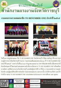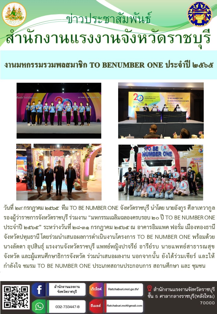 นำโดย นายอังกูร ศีลาเทวากูล รองผู้ว่าราชการจังหวัดราชบุรี ร่วมงาน “มหกรรมเฉลิมฉลองครบรอบ ๒๐ ปี TO BE NUMBER ONE ประจำปี ๒๕๖๕” ระหว่างวันที่ ๒๘-๓๑ กรกฎาคม ๒๕๖๕ ณ อาคารอิมแพค ฟอรั่ม เมืองทองธานี จังหวัดปทุมธานี โดยร่วมนำเสนอผลการดำเนินงานโครงการ TO BE NUMBER ONE พร้อมด้วยนางลัดดา อุปสินธุ์ แรงงานจังหวัดราชบุรี แพทย์หญิงปาจรีย์ อารีย์รบ นายแพทย์สาธารณสุขจังหวัด และผู้แทนศึกษาธิการจังหวัด ร่วมนำเสนอผลงาน นอกจากนั้น ยังได้ร่วมเชียร์ และให้กำลังใจ ชมรม TO BE NUMBER ONE ประเภทสถานประกอบการ สถานศึกษา และ ชุมชน