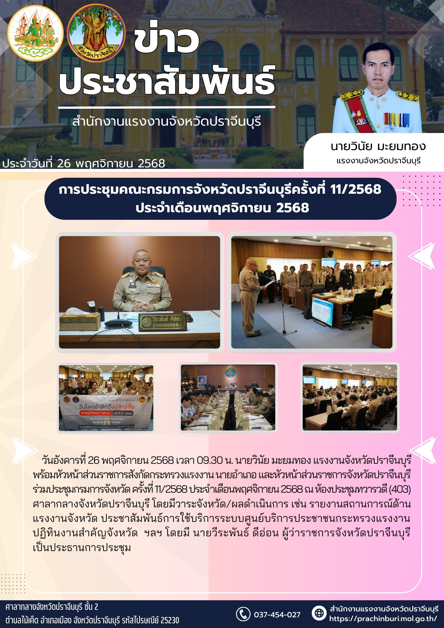 วันอังคารที่ 26 พฤศจิกายน 2568 เวลา 09.30 น. นายวินัย มะยมทอง แรงงานจังหวัดปราจีนบุรี พร้อมหัวหน้าส่วนราชการสังกัดกระทรวงแรงงาน นายอำเภอ และหัวหน้าส่วนราชการจังหวัดปราจีนบุรี ร่วมประชุมกรมการจังหวัด ครั้งที่ 11/2568 ประจำเดือนพฤศจิกายน 2568 ณ ห้องประชุมทวารวดี (403) ศาลากลางจังหวัดปราจีนบุรี โดยมีวาระจังหวัด/ผลดำเนินการ เช่น รายงานสถานการณ์ด้านแรงงานจังหวัด ประชาสัมพันธ์การใช้บริการระบบศูนย์บริการประชาชนกระทรวงแรงงาน ปฏิทินงานสำคัญจังหวัด ฯลฯ โดยมี นายวีระพันธ์ ดีอ่อน ผู้ว่าราชการจังหวัดปราจีนบุรี เป็นประธานการประชุม