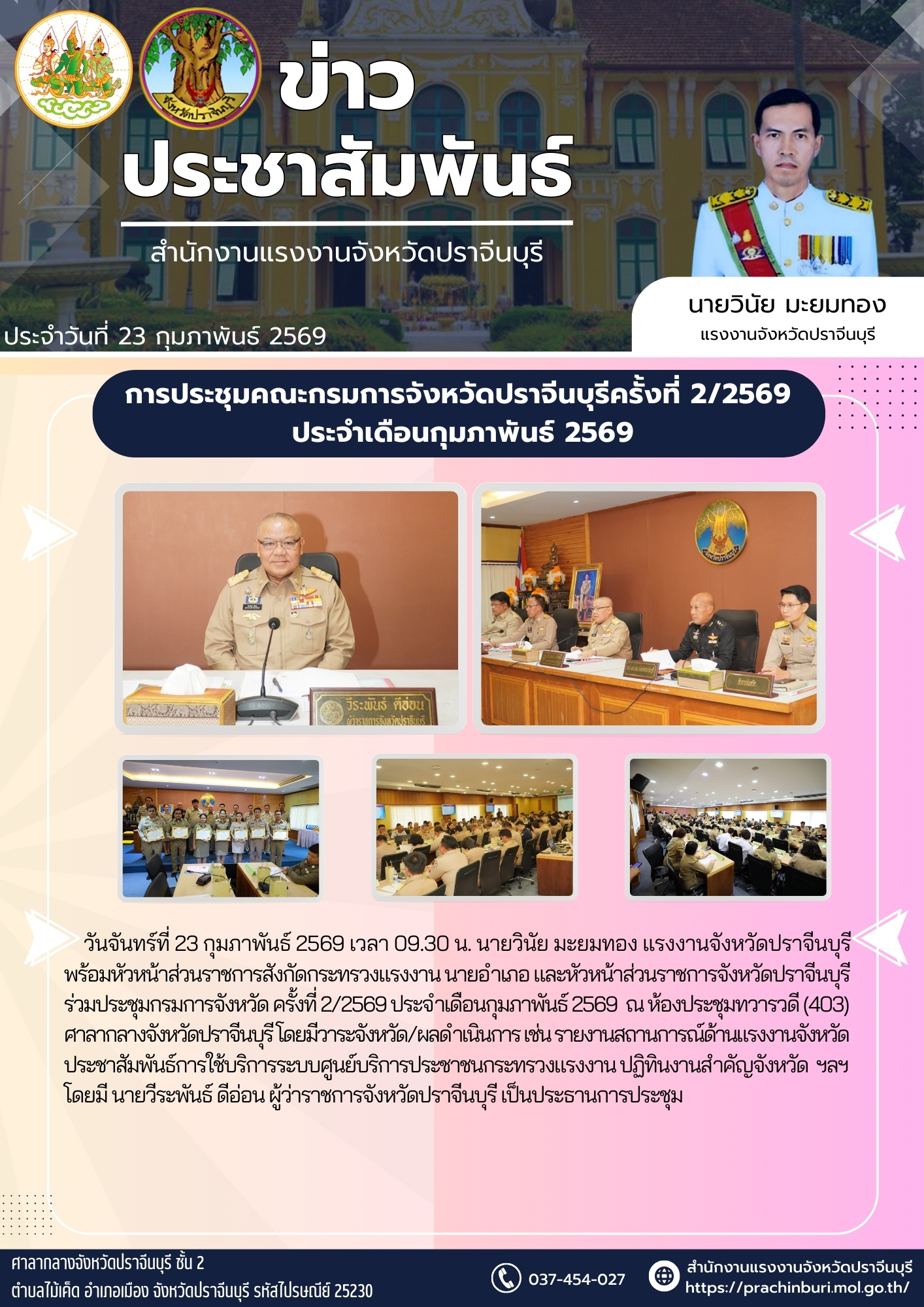 วันจันทร์ที่ 23 กุมภาพันธ์ 2569 เวลา 09.30 น. นายวินัย มะยมทอง แรงงานจังหวัดปราจีนบุรี พร้อมหัวหน้าส่วนราชการสังกัดกระทรวงแรงงาน นายอำเภอ และหัวหน้าส่วนราชการจังหวัดปราจีนบุรี ร่วมประชุมกรมการจังหวัด ครั้งที่ 2/2569 ประจำเดือนกุมภาพันธ์ 2569 ณ ห้องประชุมทวารวดี (403) ศาลากลางจังหวัดปราจีนบุรี โดยมีวาระจังหวัด/ผลดำเนินการ เช่น รายงานสถานการณ์ด้านแรงงานจังหวัด ประชาสัมพันธ์การใช้บริการระบบศูนย์บริการประชาชนกระทรวงแรงงาน ปฏิทินงานสำคัญจังหวัด ฯลฯ โดยมี นายวีระพันธ์ ดีอ่อน ผู้ว่าราชการจังหวัดปราจีนบุรี เป็นประธานการประชุม