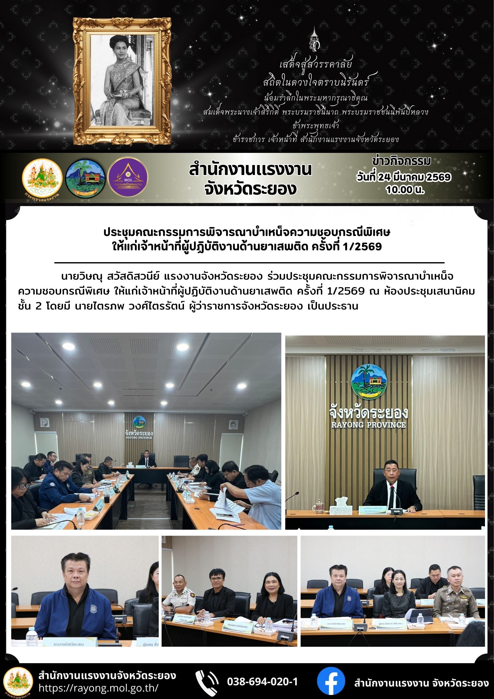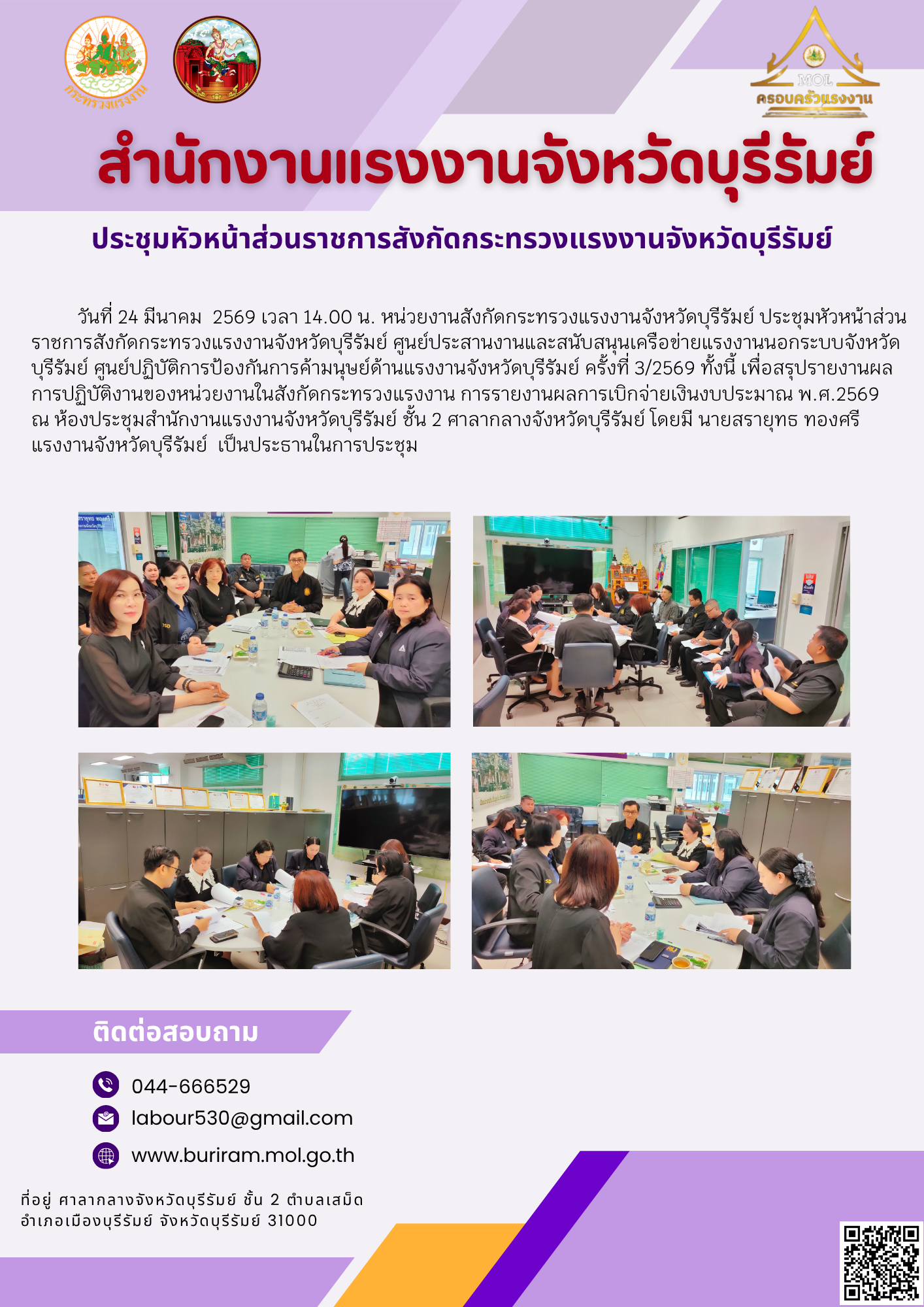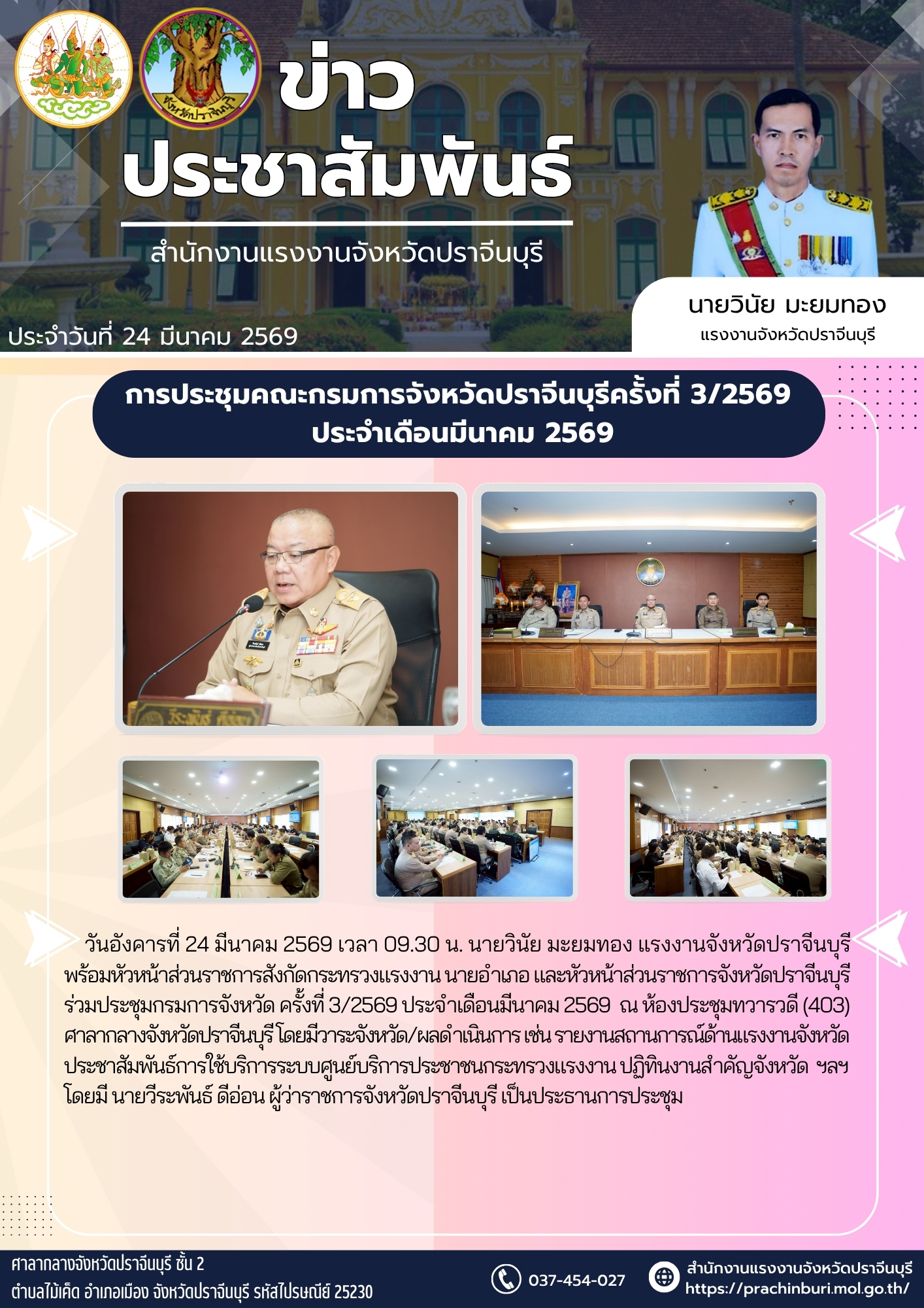 วันอังคารที่ 24 มีนาคม 2569 เวลา 09.30 น. นายวินัย มะยมทอง แรงงานจังหวัดปราจีนบุรี พร้อมหัวหน้าส่วนราชการสังกัดกระทรวงแรงงาน นายอำเภอ และหัวหน้าส่วนราชการจังหวัดปราจีนบุรี ร่วมประชุมกรมการจังหวัด ครั้งที่ 3/2569 ประจำเดือนมีนาคม 2569 ณ ห้องประชุมทวารวดี (403) ศาลากลางจังหวัดปราจีนบุรี โดยมีวาระจังหวัด/ผลดำเนินการ เช่น รายงานสถานการณ์ด้านแรงงานจังหวัด ประชาสัมพันธ์การใช้บริการระบบศูนย์บริการประชาชนกระทรวงแรงงาน ปฏิทินงานสำคัญจังหวัด ฯลฯ โดยมี นายวีระพันธ์ ดีอ่อน ผู้ว่าราชการจังหวัดปราจีนบุรี เป็นประธานการประชุม
