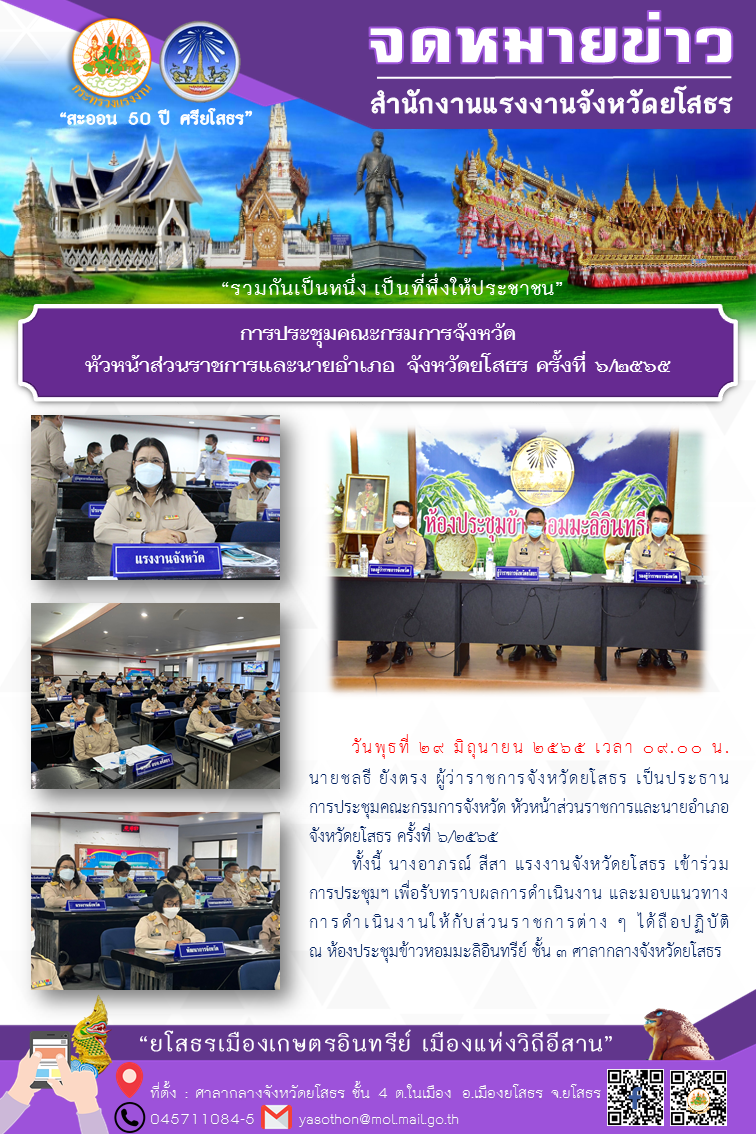 วันพุธที่ ๒๙ มิถุนายน ๒๕๖๕ เวลา ๐๙.๐๐ น. นายชลธี ยังตรง ผู้ว่าราชการจังหวัดยโสธร เป็นประธาน การประชุมคณะกรมการจังหวัด หัวหน้าส่วนราชการและนายอำเภอ จังหวัดยโสธร ครั้งที่ ๖/๒๕๖๕ ทั้งนี้ นางอาภรณ์ สีสา แรงงานจังหวัดยโสธร เข้าร่วมการประชุมฯ เพื่อรับทราบผลการดำเนินงาน และมอบแนวทางการดำเนินงานให้กับส่วนราชการต่าง ๆ ได้ถือปฏิบัติ ณ ห้องประชุมข้าวหอมมะลิอินทรีย์ ชั้น ๓ ศาลากลางจังหวัดยโสธร
