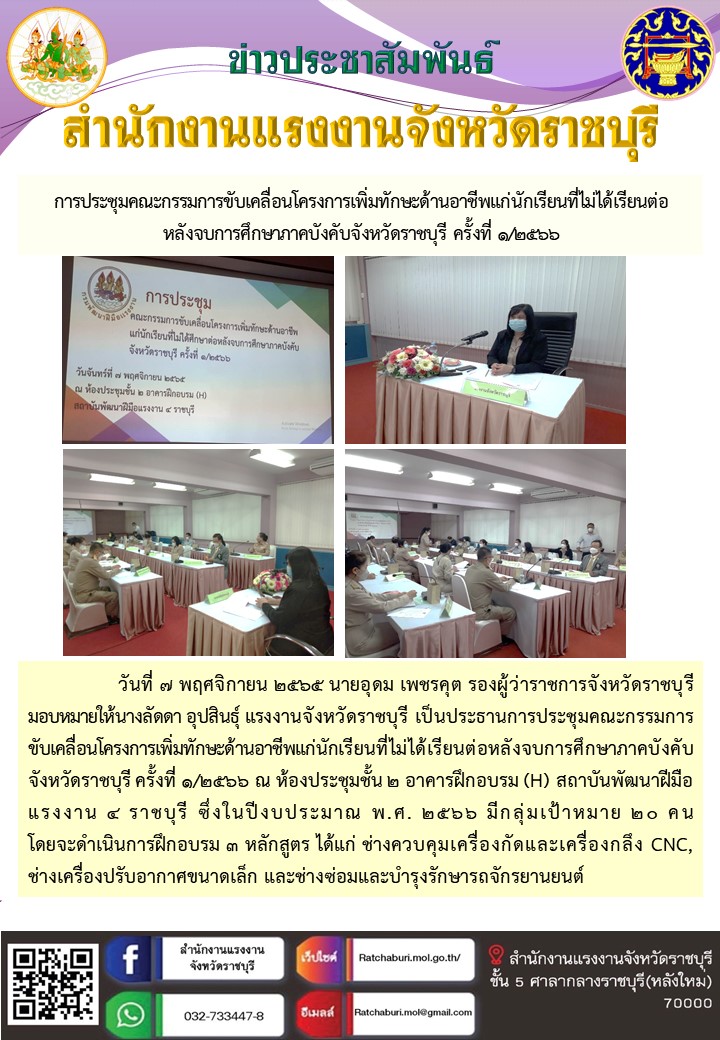 การประชุมคณะกรรมการขับเคลื่อนโครงการเพิ่มทักษะด้านอาชีพแก่นักเรียนที่ไม่ได้เรียนต่อหลังจบการศึกษาภาคบังคับจังหวัดราชบุรี ครั้งที่ 1/2566