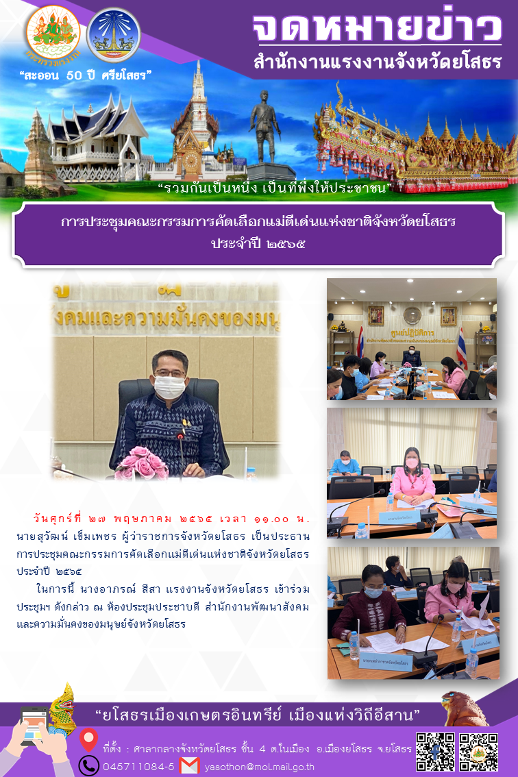 วันศุกร์ที่ ๒๗ พฤษภาคม ๒๕๖๕ เวลา ๑๑.๐๐ น. นายสุวัฒน์ เข็มเพชร ผู้ว่าราชการจังหวัดยโสธร เป็นประธานการประชุมคณะกรรมการคัดเลือกแม่ดีเด่นแห่งชาติจังหวัดยโสธรประจำปี ๒๕๖๕ ในการนี้ นางอาภรณ์ สีสา แรงงานจังหวัดยโสธร เข้าร่วมประชุมฯ ดังกล่าว ณ ห้องประชุมประชาบดี สำนักงานพัฒนาสังคมและความมั่นคงของมนุษย์จังหวัดยโสธร