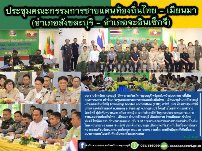 ประชุมคณะกรรมการชายแดนท้องถิ่นไทย – เมียนมา (อำเภอสังขละบุรี – อำเภอจะอินเซ็กจี) แรงงานจังหวัดกาญจนบุรี จัดหางานจังหวัดกาญจนบุรี พร้อมหัวหน้าส่วนราชการที่เป็นคณะกรรมการ เข้าร่วมประชุมคณะกรรมการชายแดนท้องถิ่นไทย – เมียนมา (อำเภอสังขละบุรี – อำเภอจะอินเซ็กจี) Township border committee (TBC) ครั้งที่ 3 ณ ห้องประชุมบาซินี่ บ้านพระเจดีย์สามองค์ ต.หนองลู อ.สังขละบุรี จ.กาญจนบุรี โดยฝ่ายไทยมี พันเอกสราวุธ ไชยสิทธิ์ ผู้บังคับหน่วยเฉพาะกิจลาดหญ้า กองกำลังสุรสีห์ ในฐานะประธานคณะกรรมการชายแดนส่วนท้องถิ่นไทย – เมียนมา อำเภอสังขละบุรี เป็นประธาน ฝ่าย เมียนมา นำโดยพันตรี ไหน่ลิน อ่าว รักษาการแทน ผบ.พัน.ร.31 ประธานคณะกรรมการชายแดนส่วนท้องถิ่นไทย – เมียนมา อำเภอจะอินเช็กจี ประเด็นการประชุม เป็นการหารือร่วมกันในเรื่องการรักษาความสงบเรียบร้อยและความมั่นคงตามแนวชายแดน รวมทั้งการแก้ไขปัญหาที่เกิดขึ้นตามแนวชายแดนในระดับท้องถิ่นของทั้งสองประเทศ
