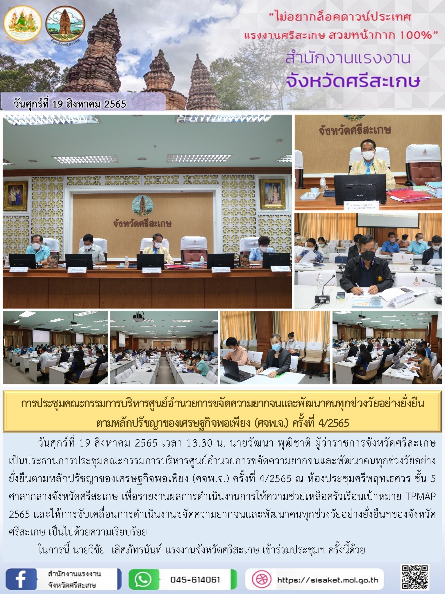 วันศุกร์ที่ 19 สิงหาคม 2565 เวลา 13.30 น. นายวัฒนา พุฒิชาติ ผู้ว่าราชการจังหวัดศรีสะเกษ เป็นประธานการประชุมคณะกรรมการบริหารศูนย์อำนวยการขจัดความยากจนและพัฒนาคนทุกช่วงวัยอย่างยั่งยืนตามหลักปรัชญาของเศรษฐกิจพอเพียง (ศจพ.จ.) ครั้งที่ 4/2565 ณ ห้องประชุมศรีพฤทเธศวร ชั้น 5 ศาลากลางจังหวัดศรีสะเกษ เพื่อรายงานผลการดำเนินงานการให้ความช่วยเหลือครัวเรือนเป้าหมาย TPMAP 2565 และให้การขับเคลื่อนการดำเนินงานขจัดความยากจนและพัฒนาคนทุกช่วงวัยอย่างยั่งยืนฯของจังหวัดศรีสะเกษ เป็นไปด้วยความเรียบร้อย