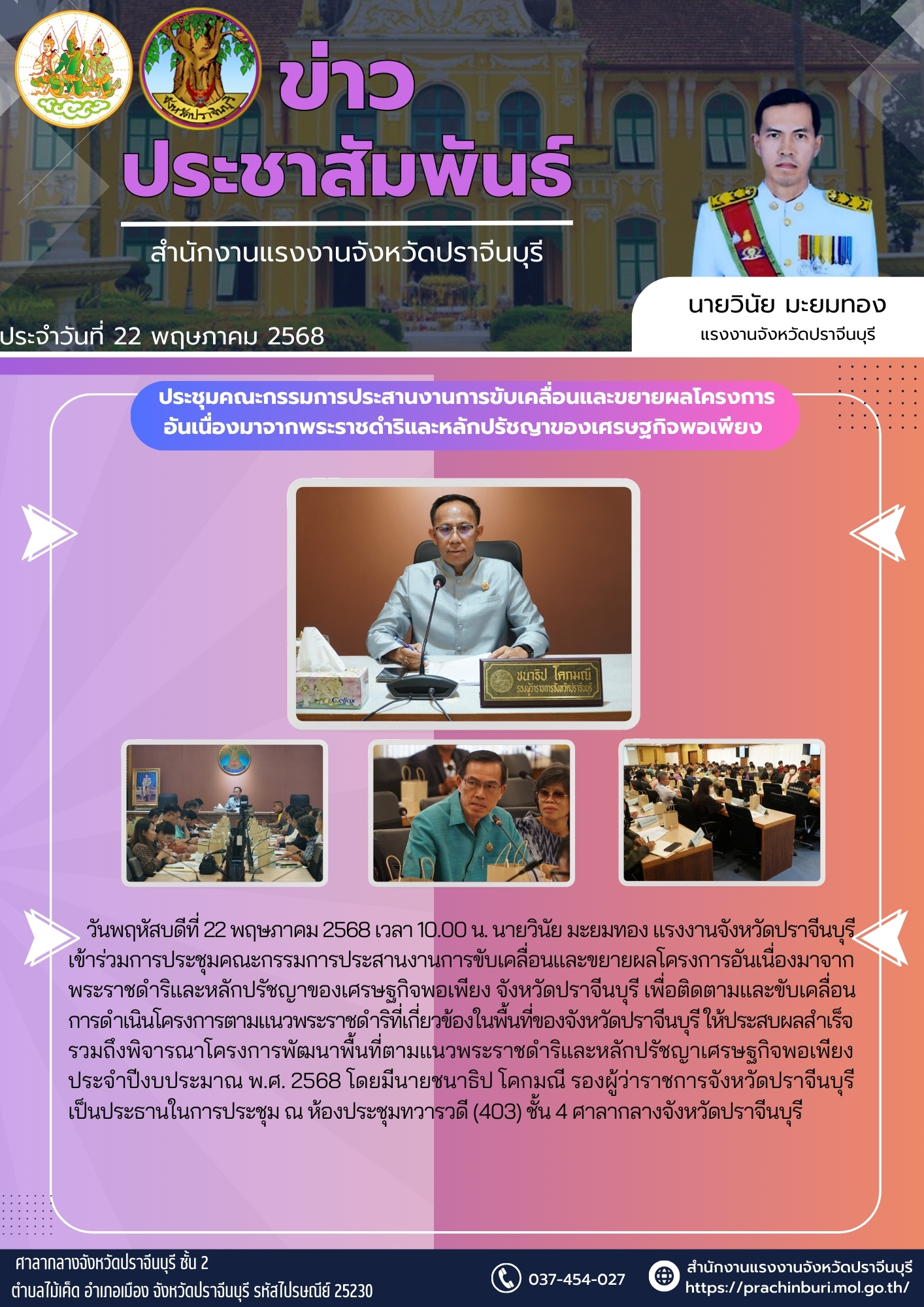วันพฤหัสบดีที่ 22 พฤษภาคม 2568 เวลา 10.00 น. นายวินัย มะยมทอง แรงงานจังหวัดปราจีนบุรี เข้าร่วมการประชุมคณะกรรมการประสานงานการขับเคลื่อนและขยายผลโครงการอันเนื่องมาจากพระราชดำริและหลักปรัชญาของเศรษฐกิจพอเพียง จังหวัดปราจีนบุรี เพื่อติดตามและขับเคลื่อน การดำเนินโครงการตามแนวพระราชดำริที่เกี่ยวข้องในพื้นที่ของจังหวัดปราจีนบุรี ให้ประสบผลสำเร็จรวมถึงพิจารณาโครงการพัฒนาพื้นที่ตามแนวพระราชดำริและหลักปรัชญาเศรษฐกิจพอเพียง ประจำปีงบประมาณ พ.ศ. 2568 โดยมีนายชนาธิป โคกมณี รองผู้ว่าราชการจังหวัดปราจีนบุรีเป็นประธานในการประชุม ณ ห้องประชุมทวารวดี (403) ชั้น 4 ศาลากลางจังหวัดปราจีนบุรี