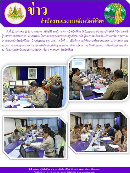 วันที่ 22 มกราคม 2561 นายสมภพ สมิตะสิริ รองผู้ว่าราชการจังหวัดพิจิตร ได้รับมอบหมายจากนายวีระศักดิ์ วิจิตร์แสงศรี ผู้ว่าราชการจังหวัดพิจิตร เป็นประธาน ในการประชุมคณะกรรมการศูนย์ช่วยเหลือผู้สบความเดือดร้อนด้านอาชีพ กระทรวงแรงงานประจำจังหวัดพิจิตร ปีงบประมาณ พ.ศ. 2561 ครั้งที่ 1 เพื่อพิจารณาให้ความเห็นชอบแผนงาน/โครงการและงบประมาณและมอบหมายส่วนราชการรับผิดชอบกำกับดูแลและตรวจติดตามโครงการแก้ไขปัญหาความเดือดร้อนด้านอาชีพ ณ ห้องประชุมสำนักงานแรงงานจังหวัด ชั้น 2 ศาลากลางจังหวัดพิจิตร