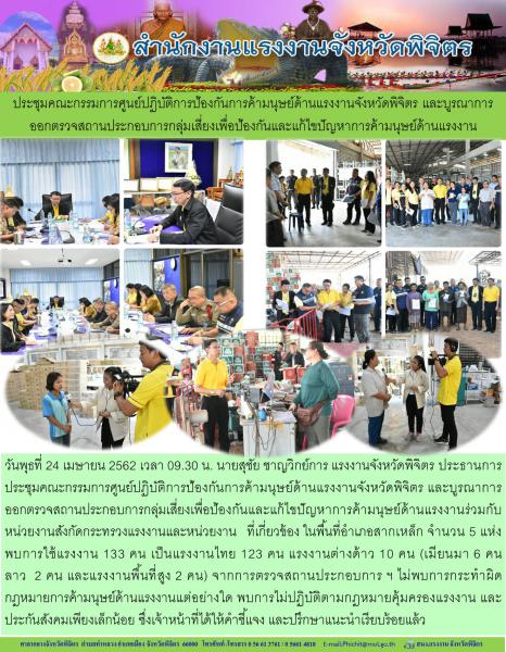 เมื่อวันพุธที่ 24 เมษายน 2562 เวลา 09.30 น. นายสุชัย ชาญวิกย์การ แรงงานจังหวัดพิจิตร ประธานการประชุมคณะกรรมการศูนย์ปฏิบัติการป้องกันการค้ามนุษย์ด้านแรงงานจังหวัดพิจิตร และบูรณาการออกตรวจสถานประกอบการกลุ่มเสี่ยงเพื่อป้องกันและแก้ไขปัญหาการค้ามนุษย์ด้านแรงงานร่วมกับหน่วยงานสังกัดกระทรวงแรงงานและหน่วยงานที่เกี่ยวข้อง ในพื้นที่อำเภอสากเหล็ก จำนวน 5 แห่ง พบการใช้แรงงาน 133 คน เป็นแรงงานไทย 123 คน แรงงานต่างด้าว 10 คน (เมียนมา 6 คน ลาว 2 คน และแรงงานพื้นที่สูง 2 คน) จากการตรวจสถานประกอบการ ฯ ไม่พบการกระทำผิดกฎหมายการค้ามนุษย์ด้านแรงงานแต่อย่างใด พบการไม่ปฏิบัติตามกฎหมายคุ้มครองแรงงาน และประกันสังคมเพียงเล็กน้อย ซึ่งเจ้าหน้าที่ได้ให้คำชี้แจง และปรึกษาแนะนำเรียบร้อยแล้ว