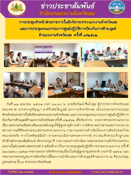 การประชุมคณะกรรมการศูนย์ปฏิบัติการป้องกันการค้ามนุษย์ด้านแรงงานจังหวัดเลย ครั้งที่ 7/2562