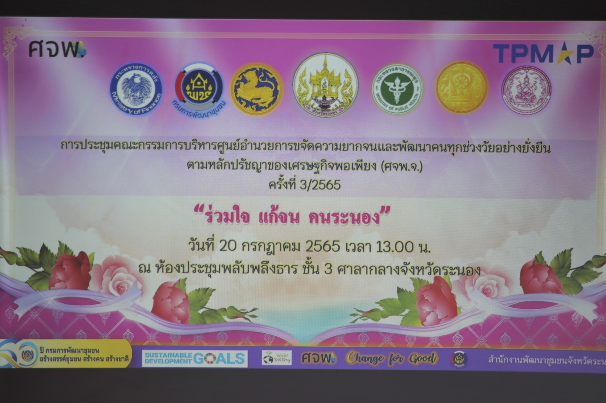 การประชุมคณะกรรมการศูนย์อำนวยการขจัดความยากจนและพัฒนาคนทุกช่วงวัยอย่างยั่งยืน ตามหลักปรัชญาเศรษฐกิจพอเพียงจังหวัดระนอง (ศจพ.จ) ครั้งที่ 3/2565