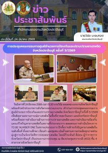 วันอังคารที่ 24 มีนาคม 2569 เวลา 13.30 นายวินัย มะยมทอง แรงงานจังหวัดปราจีนบุรี พร้อมหัวหน้าส่วนราชการสังกัดกระทรวงแรงงาน เข้าร่วมการประชุมคณะกรรมการศูนย์อำนวยการป้องกันและปราบปรามยาเสพติด จังหวัดปราจีนบุรี ครั้งที่ 3/2569 เพื่อติดตามสถานการณ์ยาเสพติดในพื้นที่ภาคตะวันออก และจังหวัดปราจีนบุรี พร้อมทั้งผลการดำเนินงานด้านการปราบปรามยาเสพติด และการดำเนินงานป้องกันและแก้ไขปัญหายาเสพติดในสถานที่ประกอบการ ตลอดจนการดำเนินโครงการ TO BE NUMBER ONE ในสถานประกอบการ อีกทั้งการเฝ้าระวังปัญหายาเสพติดในระดับพื้นที่ ทั้งสถานศึกษา เรือนจำ และชุมชน เน้นย้ำผสานความร่วมมือทุกภาคส่วน มุ่งสู่การเป็นจังหวัดสีขาวปลอดยาเสพติด โดยมีวีระพันธ์ ดีอ่อน ผู้ว่าราชการจังหวัดปราจีนบุรี เป็นประธานการประชุม ณ ห้องประชุมทวารวดี (403) ชั้น 4 ศาลากลางจังหวัดปราจีนบุรี