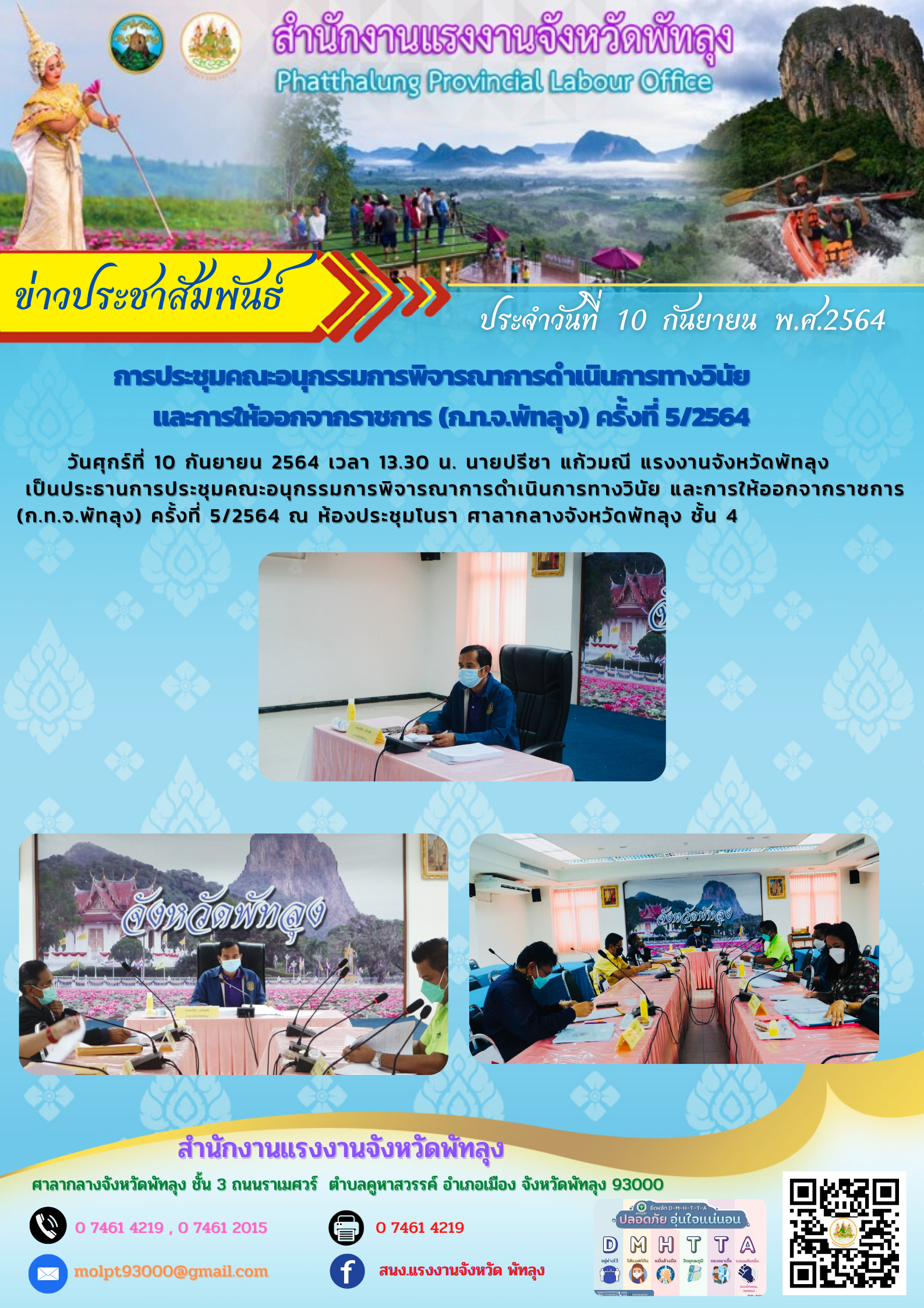 วันศุกร์ที่ 10 กันยายน 2564 เวลา 13.30 น. นายปรีชา แก้วมณี แรงงานจังหวัดพัทลุง เป็นประธานการประชุมคณะอนุกรรมการพิจารณาการดำเนินการทาวินัย และการให้ออกจากราชการ (ก.ท.จ.พัทลุง) ครั้งที่ 5/2564 ณ ห้องประชุมโนรา ศาลากลางจังหวัดพัทลุง ชั้น 4