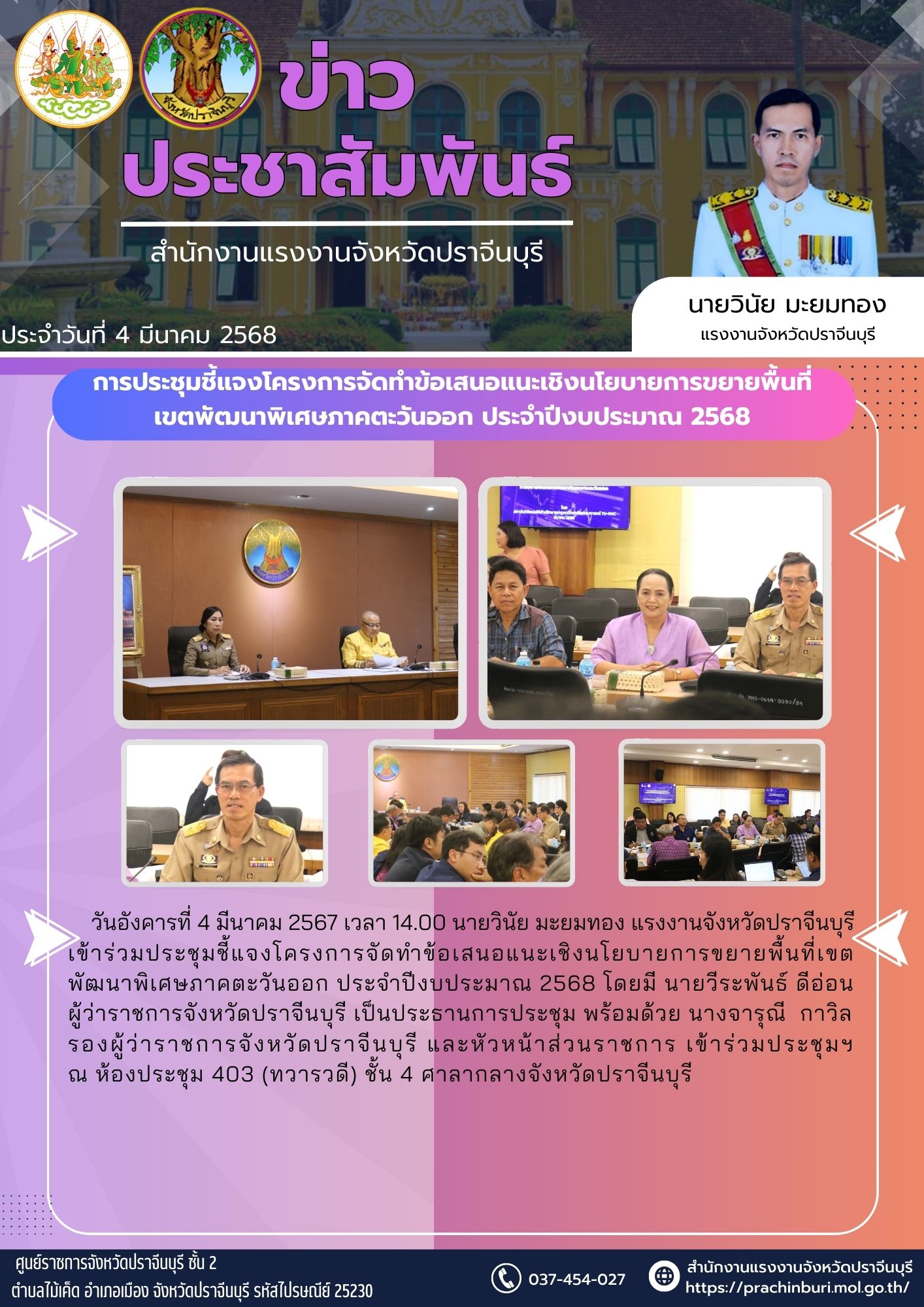 วันอังคารที่ 4 มีนาคม 2567 เวลา 14.00 นายวินัย มะยมทอง แรงงานจังหวัดปราจีนบุรี เข้าร่วมประชุมชี้แจงโครงการจัดทำข้อเสนอแนะเชิงนโยบายการขยายพื้นที่เขต พัฒนาพิเศษภาคตะวันออก ประจำปีงบประมาณ 2568 โดยมี นายวีระพันธ์ ดีอ่อน ผู้ว่าราชการจังหวัดปราจีนบุรี เป็นประธานการประชุม พร้อมด้วย นางจารุณี กาวิล รองผู้ว่าราชการจังหวัดปราจีนบุรี และหัวหน้าส่วนราชการ เข้าร่วมประชุมฯ ณ ห้องประชุม 403 (ทวารวดี) ชั้น 4 ศาลากลางจังหวัดปราจีนบุรี