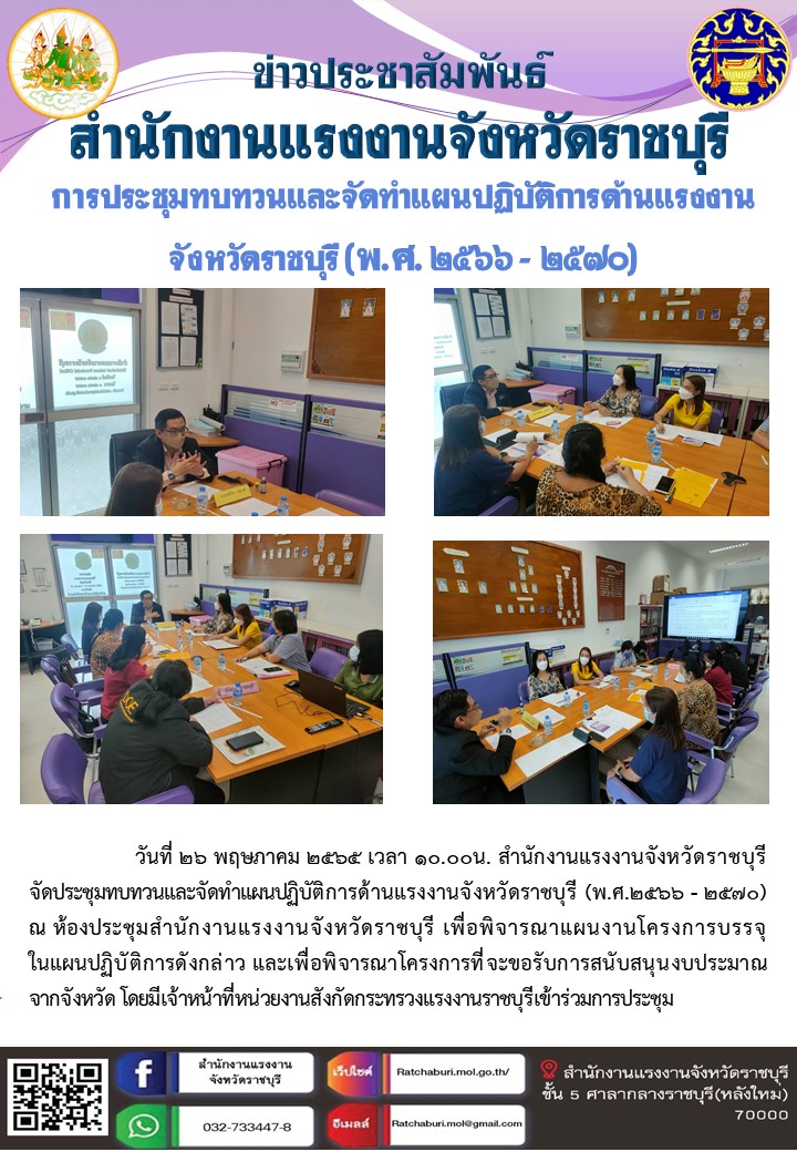 วันที่ 26 พฤษภาคม 2565 เวลา 10.00 น. สำนักงานแรงงานจังหวัดราชบุรี จัดประชุมทบทวนและจัดทำแผนปฏิบัติการด้านแรงงานจังหวัดราชบุรี (พ.ศ.2566 – 2570) ณ ห้องประชุมสำนักงานแรงงานจังหวัดราชบุรี เพื่อพิจารณาแผนงานโครงการบรรจุในแผนปฏิบัติการดังกล่าว และเพื่อพิจารณาโครงการที่จะขอรับการสนับสนุนงบประมาณจากจังหวัด โดยมีเจ้าหน้าที่หน่วยงานสังกัดกระทรวงแรงงานราชบุรีเข้าร่วมการประชุม
