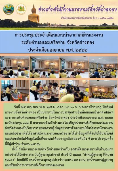 การประชุมประจำเดือนแกนนำอาสาสมัครแรงงานระดับตำบลและเครือข่าย จังหวัดอ่างทอง ประจำเดือนเมษายน พ.ศ. 2562