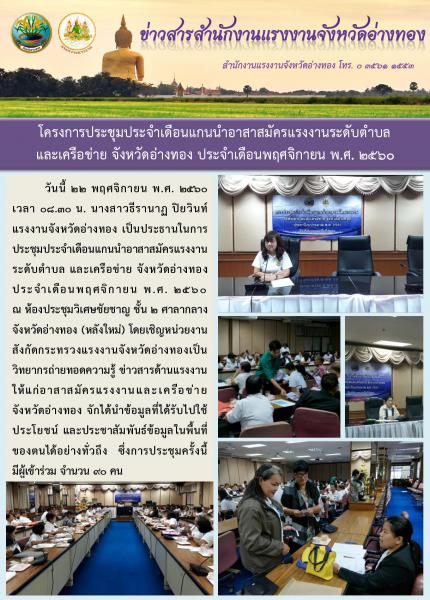 การประชุมประจำเดือนแกนนำอาสาสมัครแรงงานระดับตำบล และเครือข่าย จังหวัดอ่างทอง ประจำเดือนพฤศจิกายน พ.ศ. 2560
