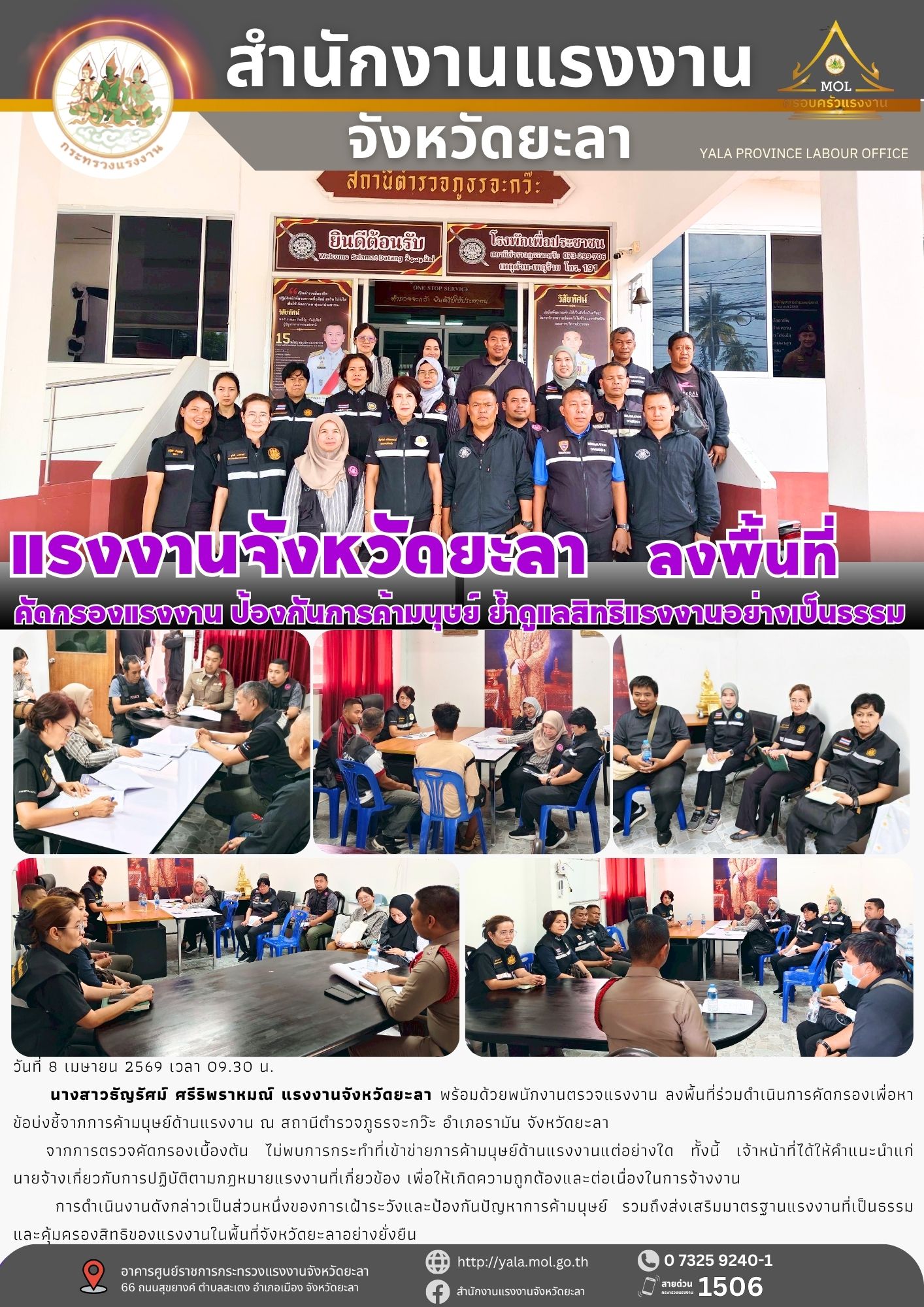 แรงงานจังหวัดยะลา ลงพื้นที่คัดกรองแรงงาน ป้องกันการค้ามนุษย์ ย้ำดูแลสิทธิแรงงานอย่างเป็นธรรม