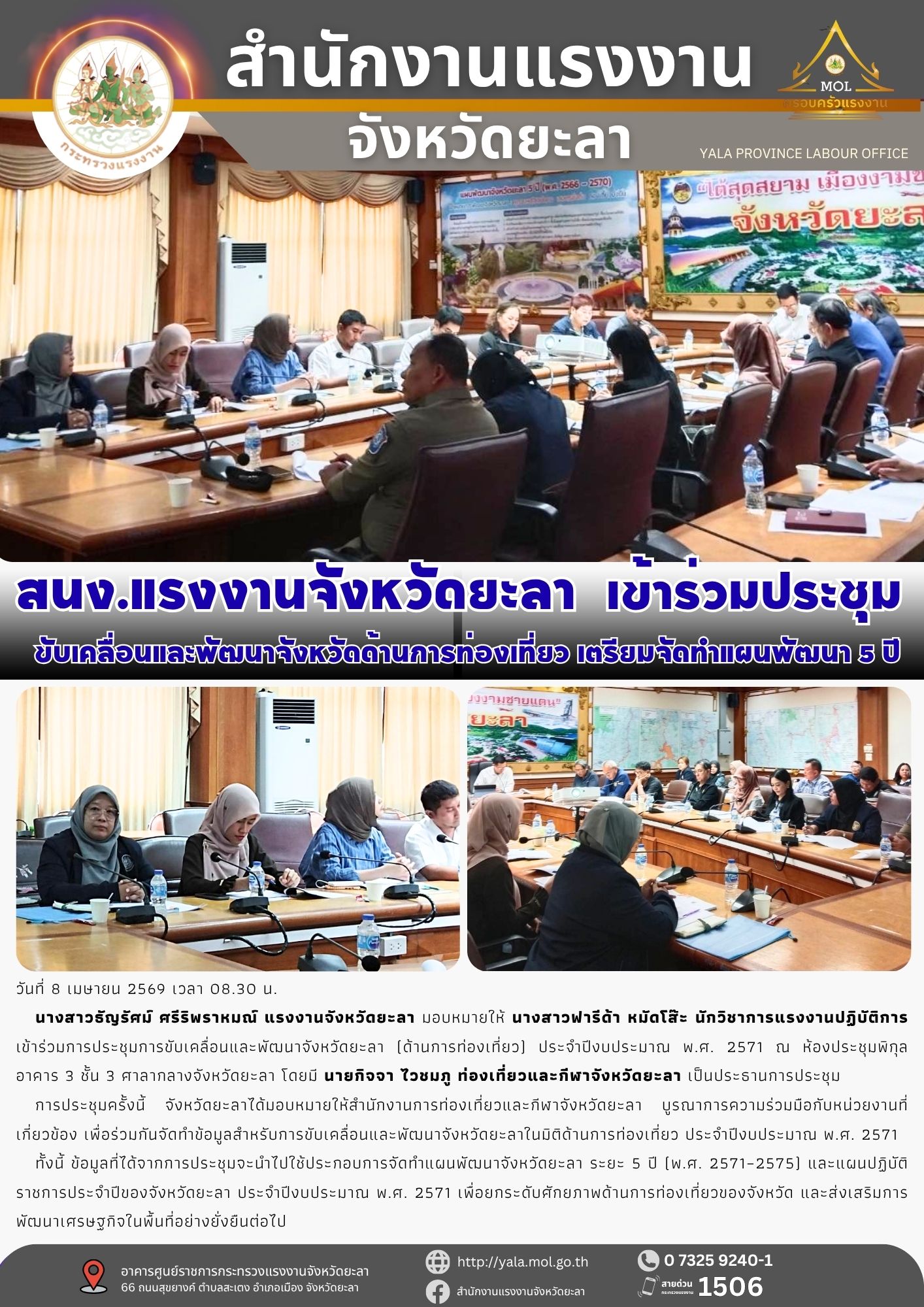 สนง. แรงงานจังหวัดยะลา เข้าร่วมประชุมขับเคลื่อนและพัฒนาจังหวัดด้านการท่องเที่ยว เตรียมจัดทำแผนพัฒนา 5 ปี