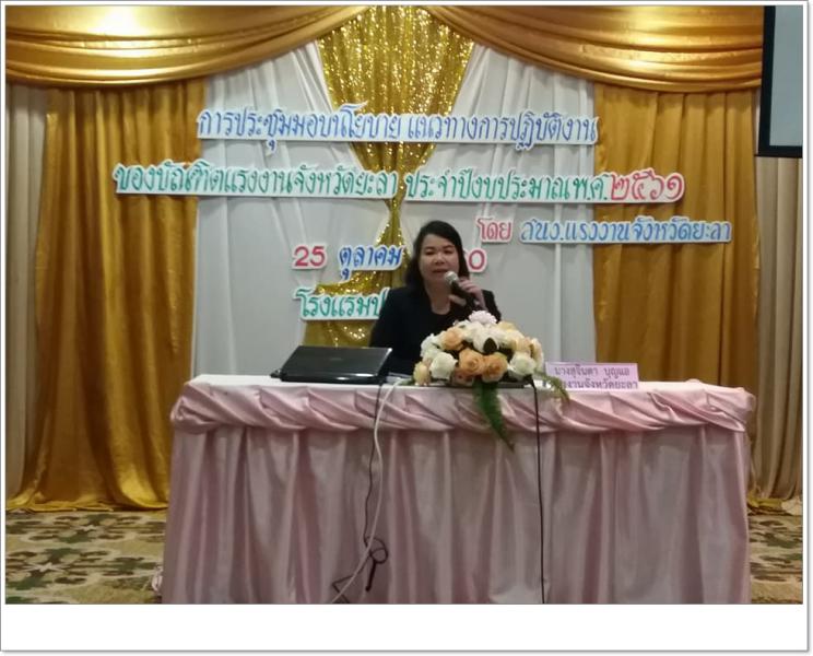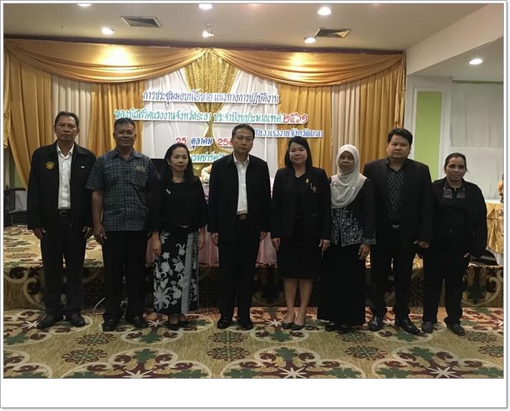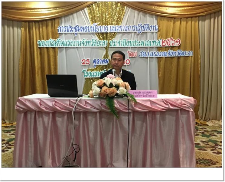 เมื่อวันที่ 25 ตุลาคม 2560 นายอนุชิต ตระกูลมุทุตา ผู้ว่าราชการจังหวัดยะลา เป็นประธานการประชุมมอบนโยบายแนวทางการปฏิบัติงานแก่บัณฑิตแรงงานจังหวัดยะลา ประจำปีงบประมาณ พ.ศ.2561 โดยมีหัวหน้าส่วนราชการสังกัดกระทรวงแรงงานจังหวัดยะลา ร่วมเป็นเกียรติและ มอบนโยบายแนวทางในการปฏิบัติงานฯ ณ ห้องพิมพ์มาดา โรงแรมปาร์ควิว อ.เมือง จ.ยะลา