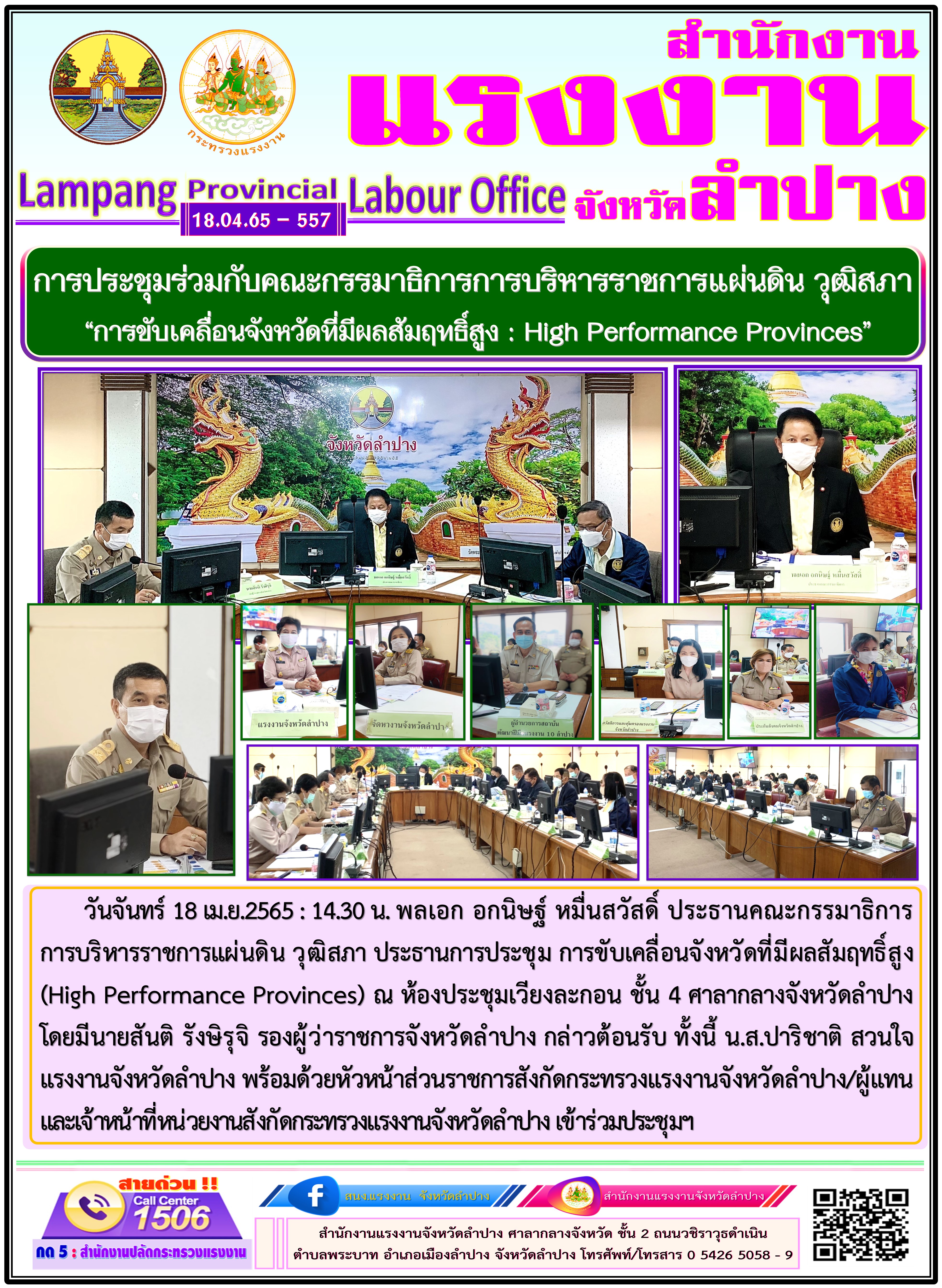 วันจันทร์ 18 เม.ย.2565 : 14.30 น. พลเอก อกนิษฐ์ หมื่นสวัสดิ์ ประธานคณะกรรมาธิการการบริหารราชการแผ่นดิน วุฒิสภา ประธานการประชุม การขับเคลื่อนจังหวัดที่มีผลสัมฤทธิ์สูง (High Performance Provinces) ณ ห้องประชุมเวียงละกอน ชั้น 4 ศาลากลางจังหวัดลำปาง