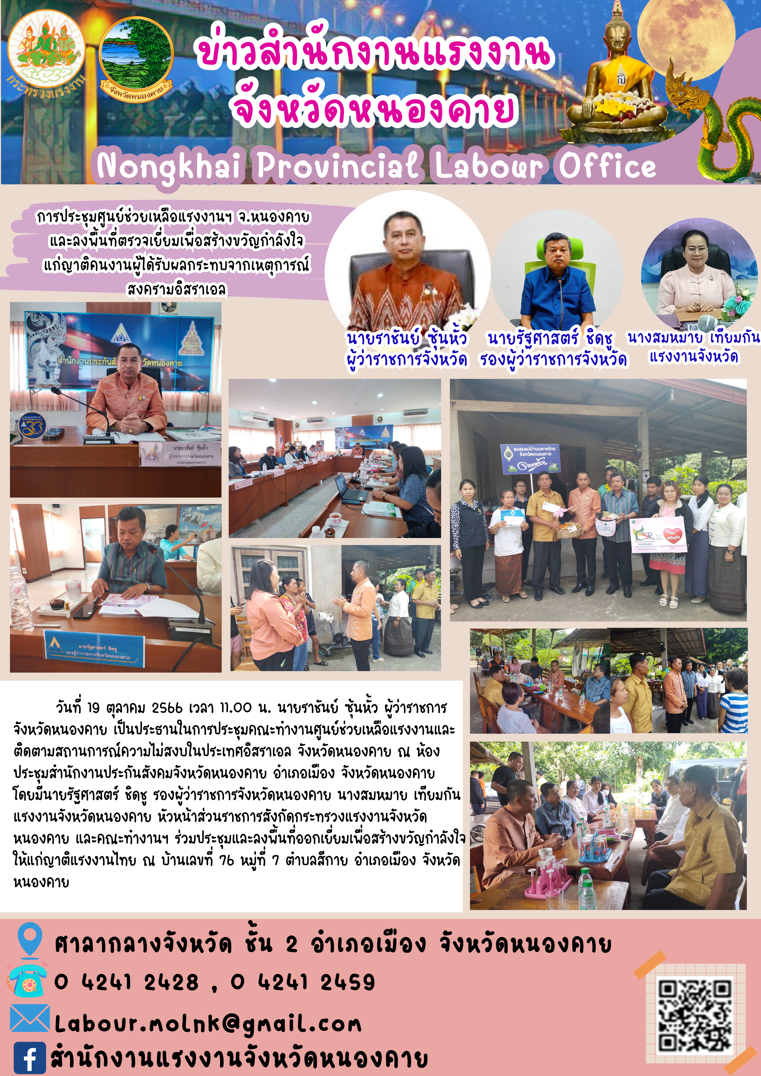 วันที่ 19 ตุลาคม 2566 เวลา 11.00 น. นายราชันย์ ซุ้นหั้ว ผู้ว่าราชการจังหวัดหนองคาย เป็นประธานในการประชุมคณะทำงานศูนย์ช่วยเหลือแรงงานและติดตามสถานการณ์ความไม่สงบในประเทศอิสราเอล จังหวัดหนองคาย ณ ห้องประชุมสำนักงานประกันสังคมจังหวัดหนองคาย อำเภอเมือง จังหวัดหนองคาย โดยมีนายรัฐศาสตร์ ชิดชู รองผู้ว่าราชการจังหวัดหนองคาย นางสมหมาย เทียมกัน แรงงานจังหวัดหนองคาย หัวหน้าส่วนราชการสังกัดกระทรวงแรงงานจังหวัดหนองคาย และคณะทำงานฯ ร่วมประชุมและลงพื้นที่ออกเยี่ยมเพื่อสร้างขวัญกำลังใจให้แก่ญาติแรงงานไทย ณ บ้านเลขที่ 76 หมู่ที่ 7 ตำบลสีกาย อำเภอเมือง จังหวัดหนองคาย