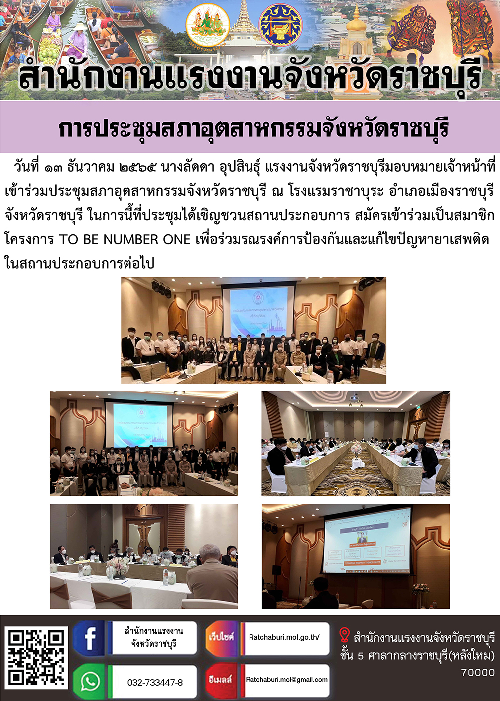 วันที่ ๑๓ ธันวาคม ๒๕๖๕ นางลัดดา อุปสินธุ์ แรงงานจังหวัดราชบุรีมอบหมายเจ้าหน้าที่เข้าร่วมประชุมสภาอุตสาหกรรมจังหวัดราชบุรี ณ โรงแรมราชาบุระ อำเภอเมืองราชบุรีจังหวัดราชบุรี ในการนี้ที่ประชุมได้เชิญชวนสถานประกอบการ สมัครเข้าร่วมเป็นสมาชิกโครงการ TO BE NUMBER ONE เพื่อร่วมรณรงค์การป้องกันและแก้ไขปัญหายาเสพติดในสถานประกอบการต่อไป
