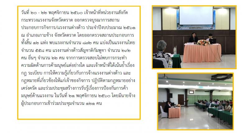 การประชุมสร้างการรับรู้เรื่องการป้องกันการค้ามนุษย์ด้านแรงงานและออกตรวจบูรณาการสถานประกอบการในจังหวัดตราด