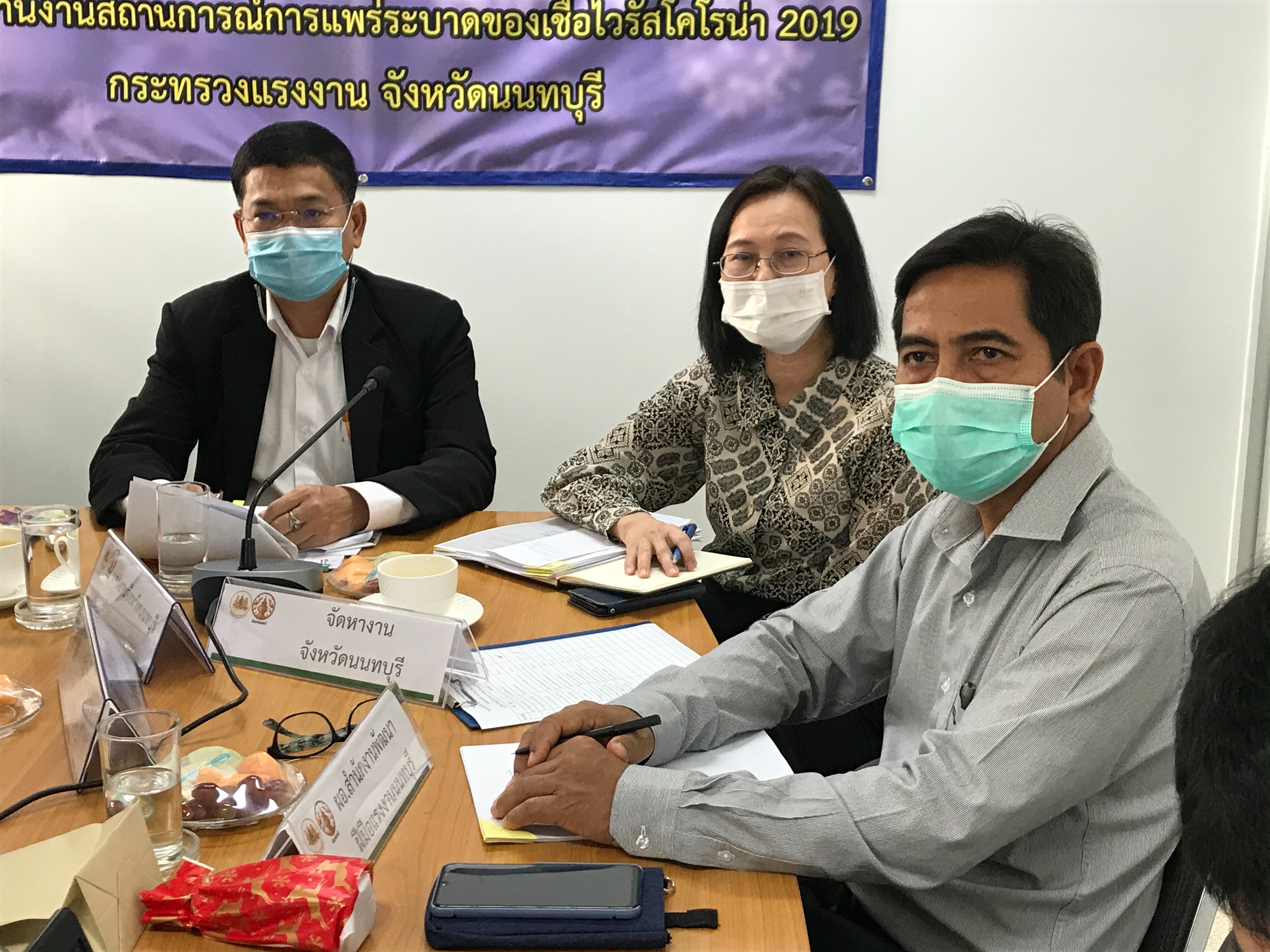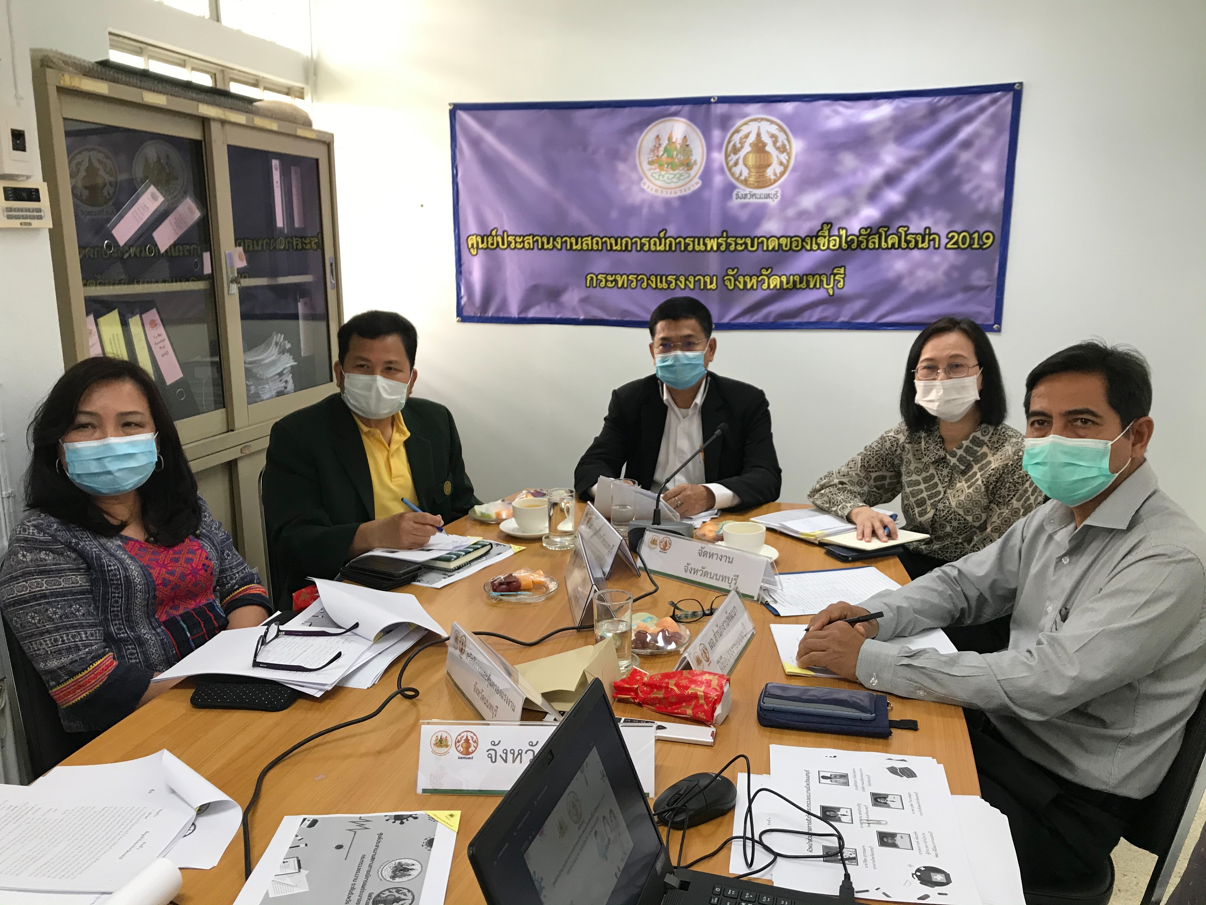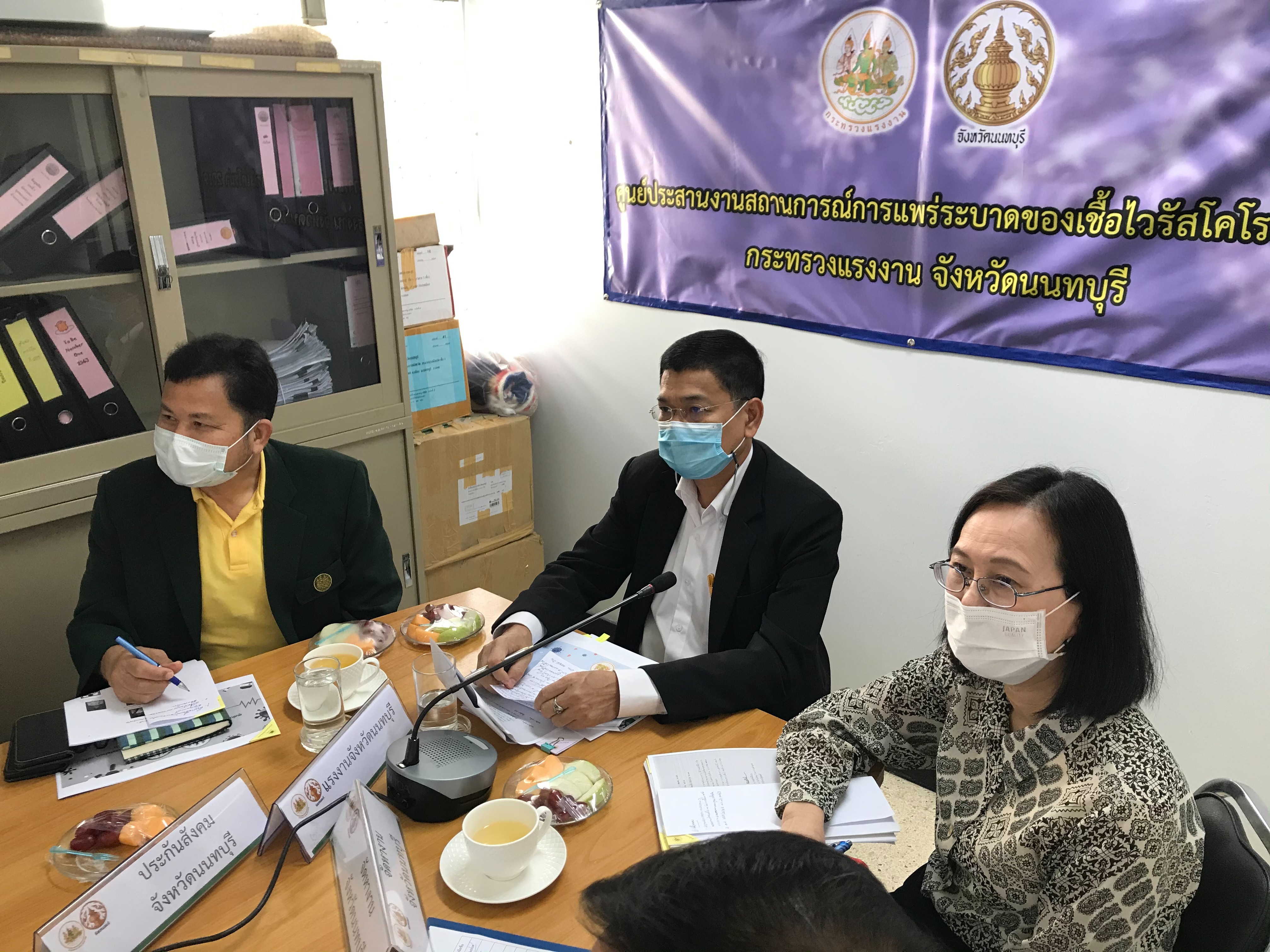 วันที่ 7 มกราคม 2564 เวลา 14.00น. นายวิชิตร สุวรรณมาก แรงงานจังหวัดนนทบุรี นางอนุวรรณ แสงประเสริฐ จัดหางานจังหวัดนนทบุรี นายอัครินทร์ ธารีฉัตรไพศาล สวัสดิการและคุ้มครองจังหวัดนนทบุรี นายสงกรานต์ เพิ่มฤๅชัย ผู้อำนวยการสำนักงานพัฒนาฝีมือแรงงานนนทบุรี และนางชวนพิศ วิระวงษ์นุสร ประกันสังคมจังหวัดนนทบุรี ร่วมประชุมหัวหน้าส่วนราชการจังหวัดภาคกลาง และภาคตะวันออกเพื่อติดตามสถานการณ์การแพร่ระบาดของโรคติดเชื้อไวรัสโคโรนา ๒๐๑๙ ผ่านระบบการประชุมทางไกล (VDO Conference) โดยมีนายสุรชัย ชัยตระกูลทอง ผู้ช่วยรัฐมนตรี ประจำกระทรวงแรงงาน เป็นประธานการประชุม ทั้งนี้ นายวิชิตร สุวรรณมาก แรงงานจังหวัดนนทบุรี เป็นผู้รายงานผลการปฏิบัติงานของศูนย์ประสานงานสถานการณ์การแพร่ระบาดของโรคติดเชื้อไวรัสโคโรนา 2019 กระทรวงแรงงาน จังหวัดนนทบุรี