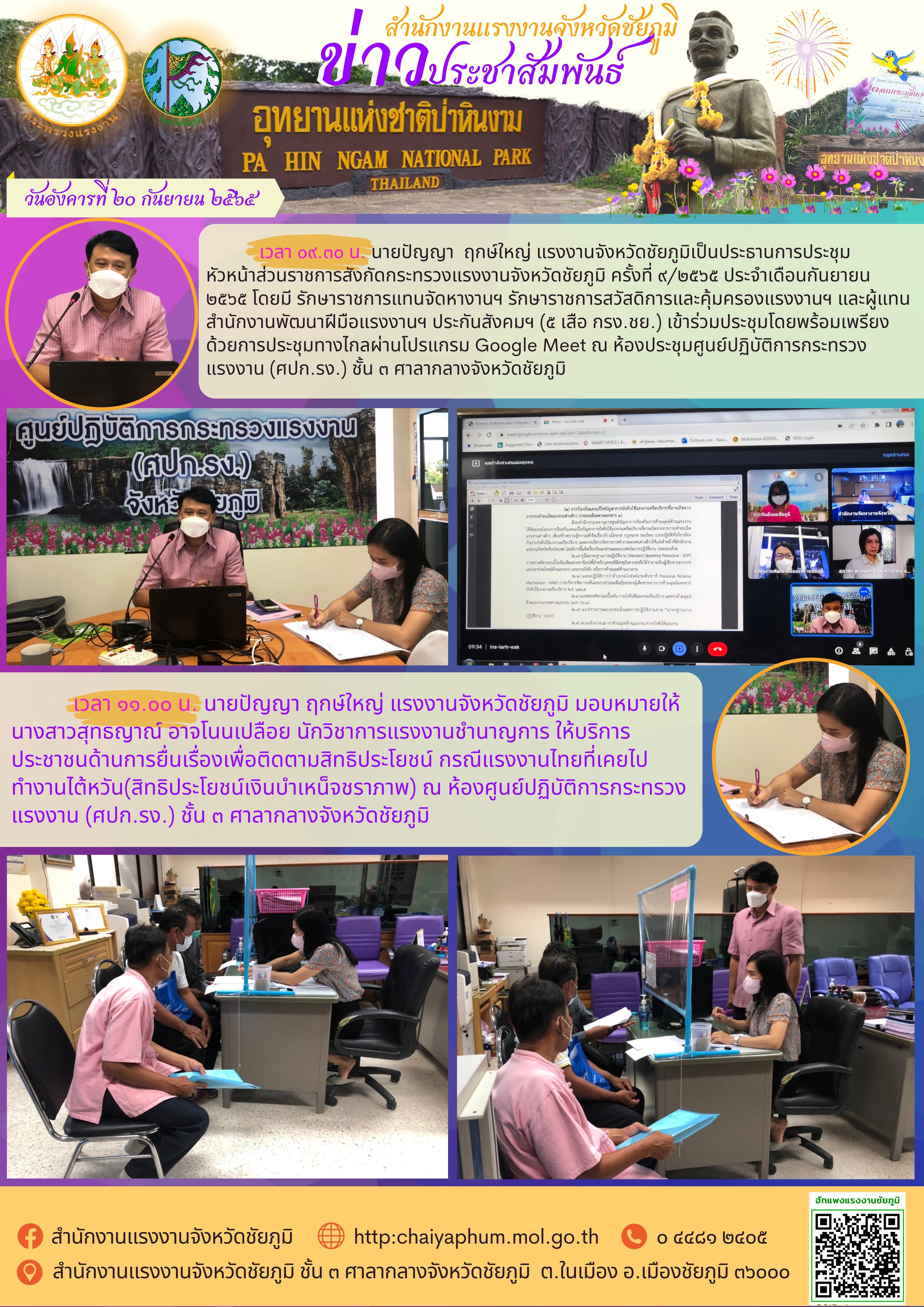 การประชุมหัวหน้าส่วนราชการสังกัดกระทรวงแรงงานจังหวัดชัยภูมิ ครั้งที่ ๙/๒๕๖๕ ประจำเดือนกันยายน ๒๕๖๕ /และการ ให้บริการประชาชนด้านการยื่นเรื่องเพื่อติดตามสิทธิประโยชน์ กรณีแรงงานไทยที่เคยไปทำงานไต้หวัน(สิทธิประโยชน์เงินบำเหน็จชราภาพ) ณ ห้องศูนย์ปฏิบัติการกระทรวงแรงงาน (ศปก.รง.) ชั้น ๓ ศาลากลางจังหวัดชัยภูมิ