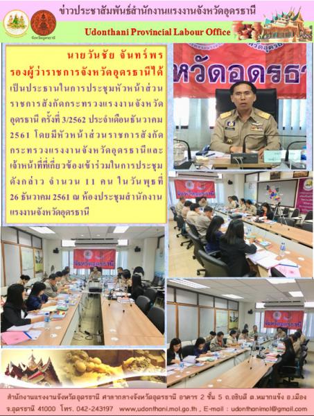 การประชุมหัวหน้าส่วนราชการสังกัดกระทรวงแรงงานจังหวัดอุดรธานี ครั้งที่ 3/2562 ประจำเดือนธันวาคม 2561