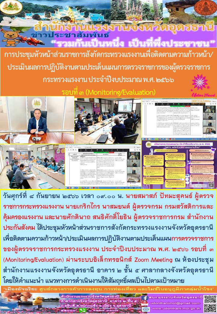 สรจ.อุดรธานี เข้าร่วมการประชุมหัวหน้าส่วนราชการสังกัดกระทรวงแรงงานเพื่อติดตามความก้าวหน้า/ประเมินผลการปฏิบัติงานตามประเด็นแผนการตรวจราชการของผู้ตรวจราชการกระทรวงแรงงาน ประจำปีงบประมาณ พ.ศ. 2566 รอบที่ 3 (Monitoring/Evaluation)