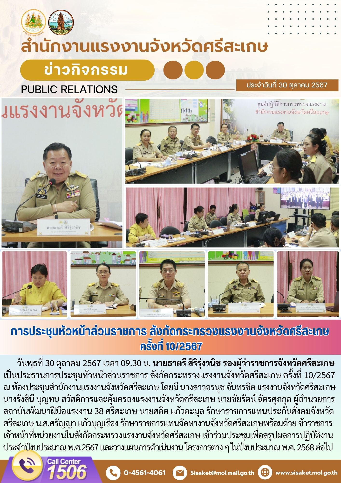 เป็นประธานการประชุมหัวหน้าส่วนราชการ สังกัดกระทรวงแรงงานจังหวัดศรีสะเกษ ครั้งที่ 10/2567