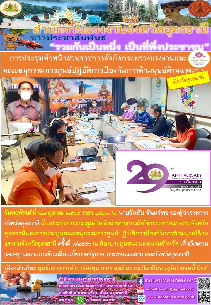 การประชุมหัวหน้าส่วนราชการสังกัดกระทรวงแรงงานและคณะอนุกรรมการศูนย์ปฏิบัติการป้องกันการค้ามนุษย์ด้านแรงงานจังหวัดอุดรธานี