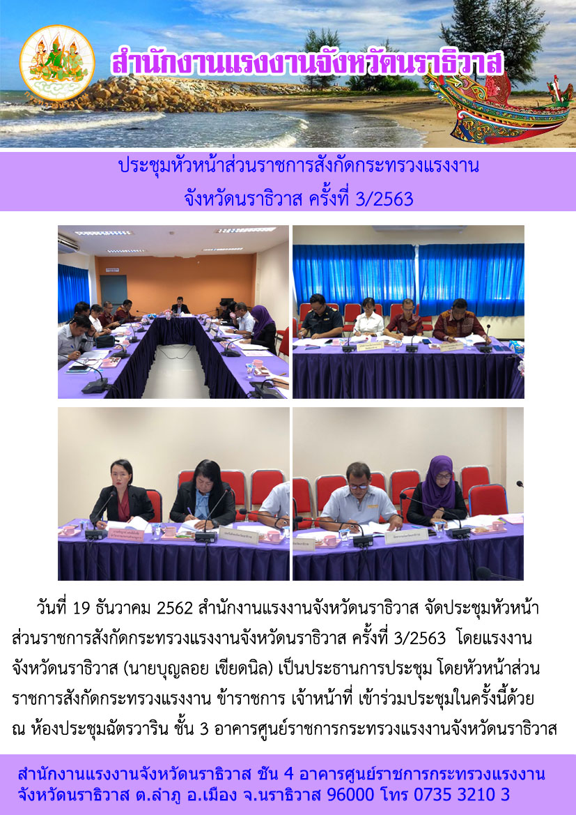 การประชุมหัวหน้าส่วนสังกัดกระทรวงแรงงานจังหวัดนราธิวาส ครั้งที่ 3/2563