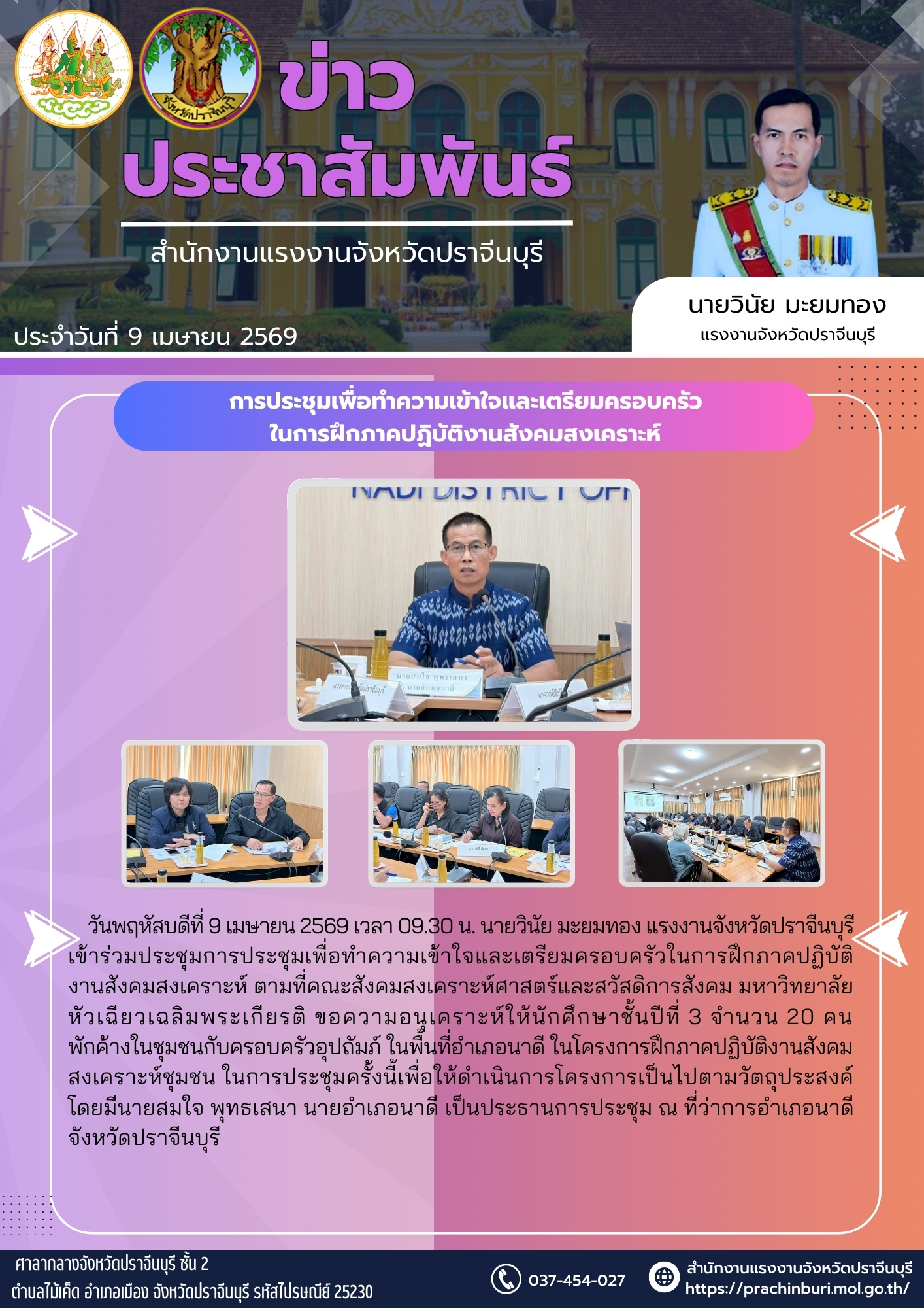 วันพฤหัสบดีที่ 9 เมษายน 2569 เวลา 09.30 น. นายวินัย มะยมทอง แรงงานจังหวัดปราจีนบุรี เข้าร่วมประชุมการประชุมเพื่อทำความเข้าใจและเตรียมครอบครัวในการฝึกภาคปฏิบัติงานสังคมสงเคราะห์ ตามที่คณะสังคมสงเคราะห์ศาสตร์และสวัสดิการสังคม มหาวิทยาลัยหัวเฉียวเฉลิมพระเกียรติ ขอความอนุเคราะห์ให้นักศึกษาชั้นปีที่ 3 จำนวน 20 คน พักค้างในชุมชนกับครอบครัวอุปถัมภ์ ในพื้นที่อำเภอนาดี ในโครงการฝึกภาคปฏิบัติงานสังคมสงเคราะห์ชุมชน ในการประชุมครั้งนี้เพื่อให้ดำเนินการโครงการเป็นไปตามวัตถุประสงค์ โดยมีนายสมใจ พุทธเสนา นายอำเภอนาดี เป็นประธานการประชุม ณ ที่ว่าการอำเภอนาดี จังหวัดปราจีนบุรี