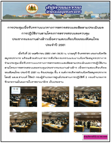 การประชุมเพื่อรับทราบแนวทางการตรวจสอบและติดตามประเมินผลการปฏิบัติงานตามโครงการตรวจสอบและควบคุมประชากรแรงงานต่างด้าวเพื่อความสงบเรียบร้อยของสังคมไทย ประจำปี 2561