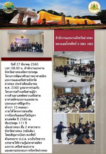การประชุมโครงการพัฒนาศักยภาพอาสาสมัครแรงงานและเครือข่ายจังหวัดอ่างทอง ประจำเดือนมีนาคม พ.ศ. 2560 บูรณาการร่วมกับโครงการสร้างเครือข่ายผู้นำการต้านยาเสพติดจากเครือข่ายอาสาสมัครแรงงานและสถานประกอบการที่มีลูกจ้างต่ำกว่า 10 คนลงมา